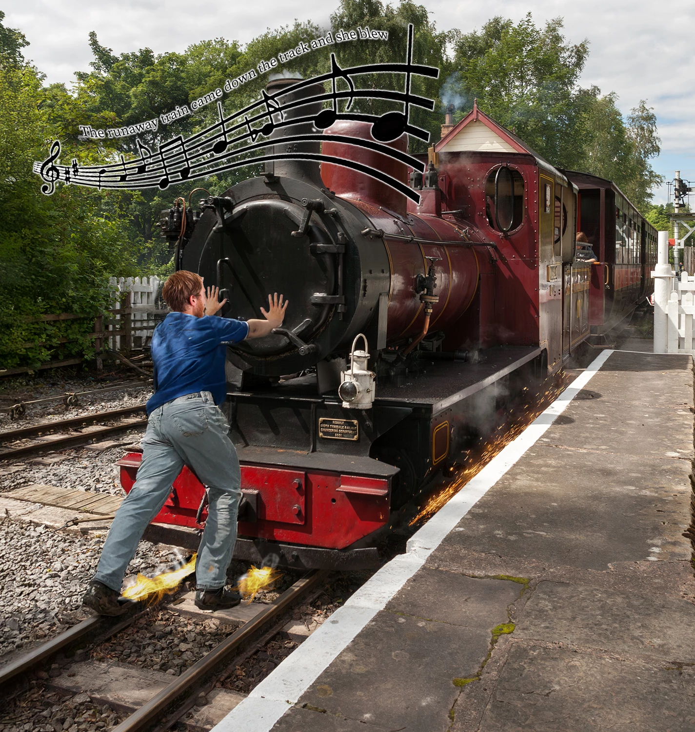 I love the flames on his shoes as he tries to stop the train.
