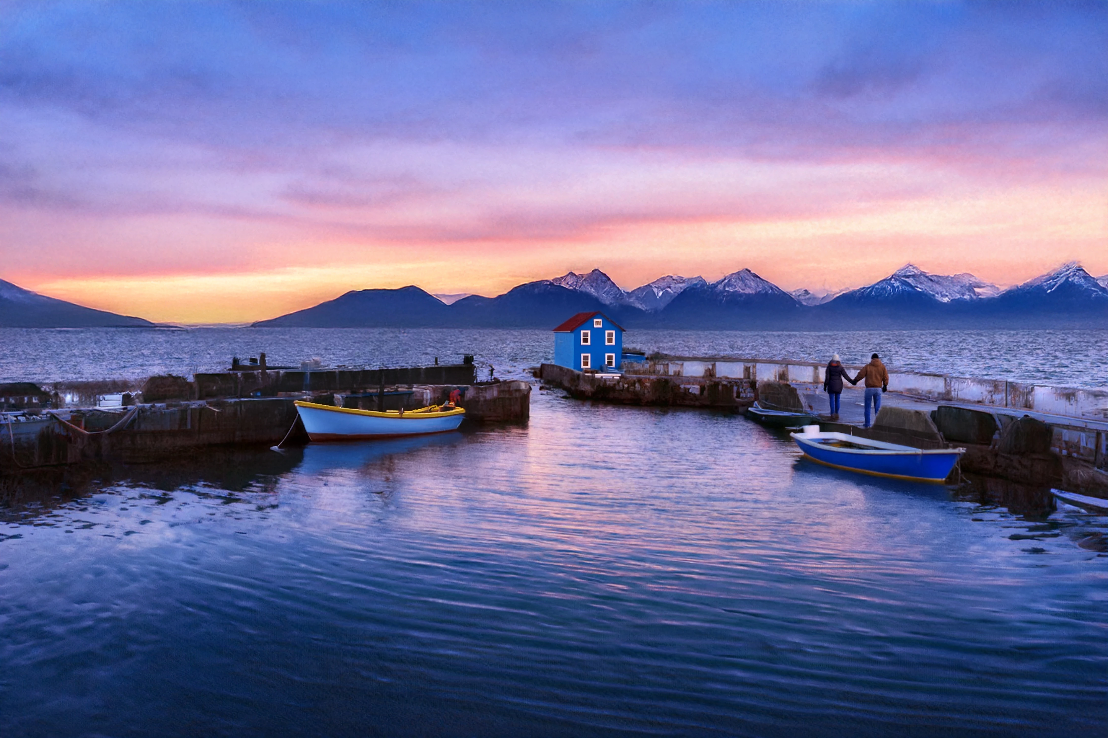 Looks like something from Sweden or Norway. Love the boating house at the end.