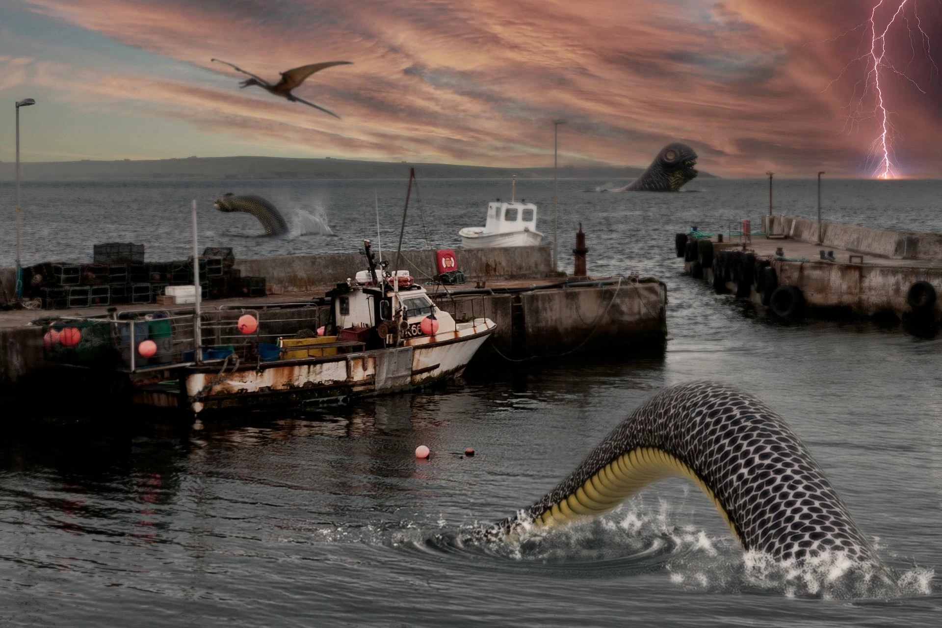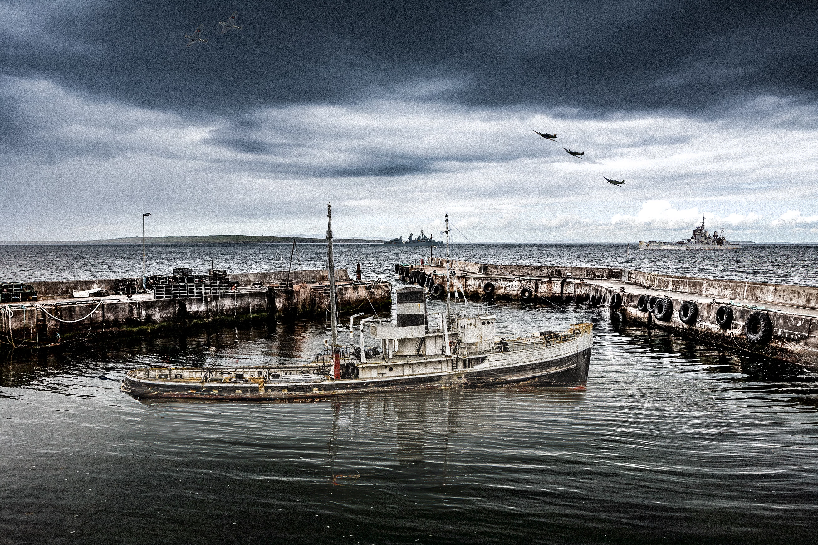 The image was crying out for a gritty look, and my formative years were in post-war Scotland. The high-contrast grainy look comes mostly from maxing out Clarity and Grain and reduced saturation in the ACR filter in the main image, but all the composited images got the same treatment. The big ship on the right is the King George V, which would have been seen in that area during war years.