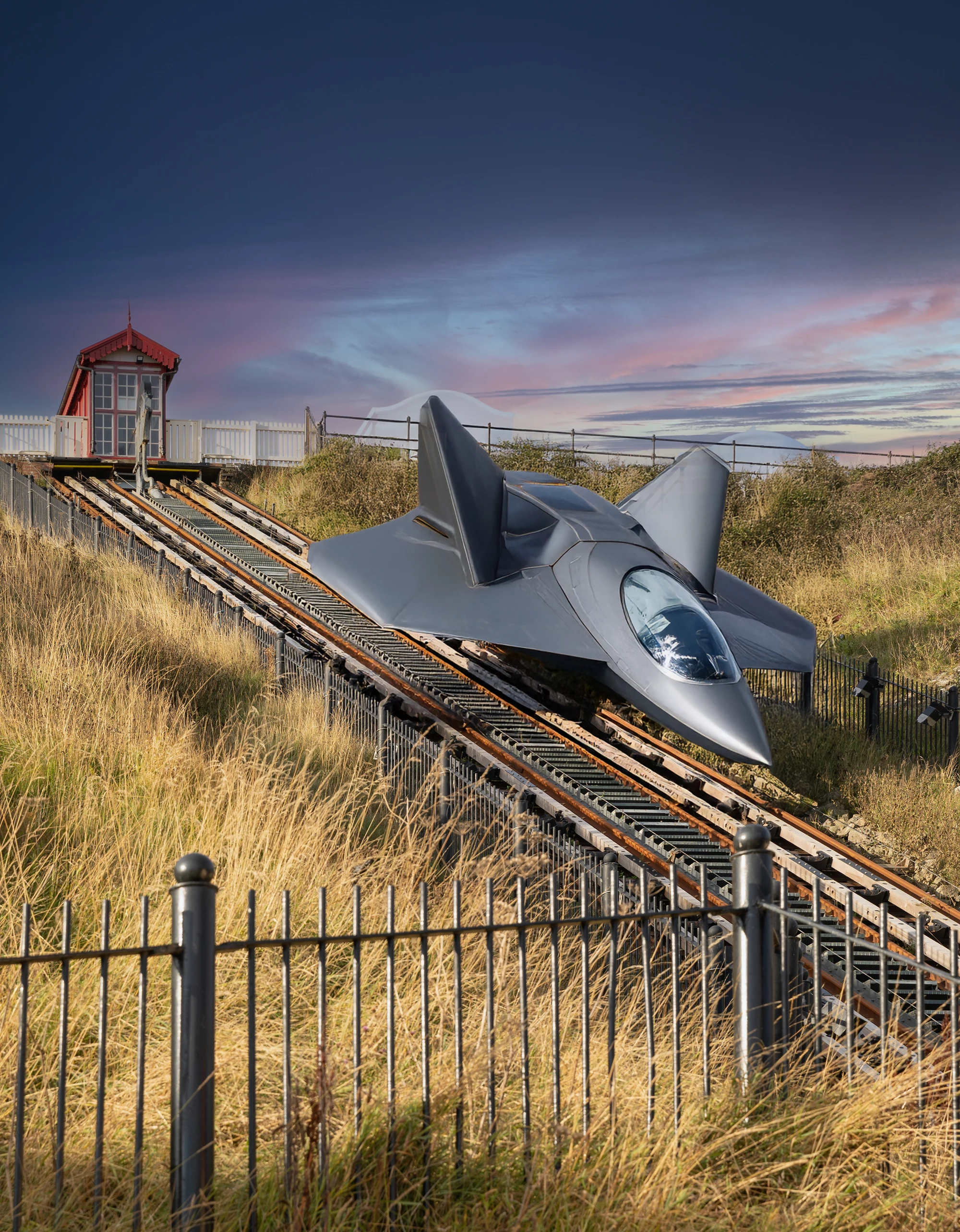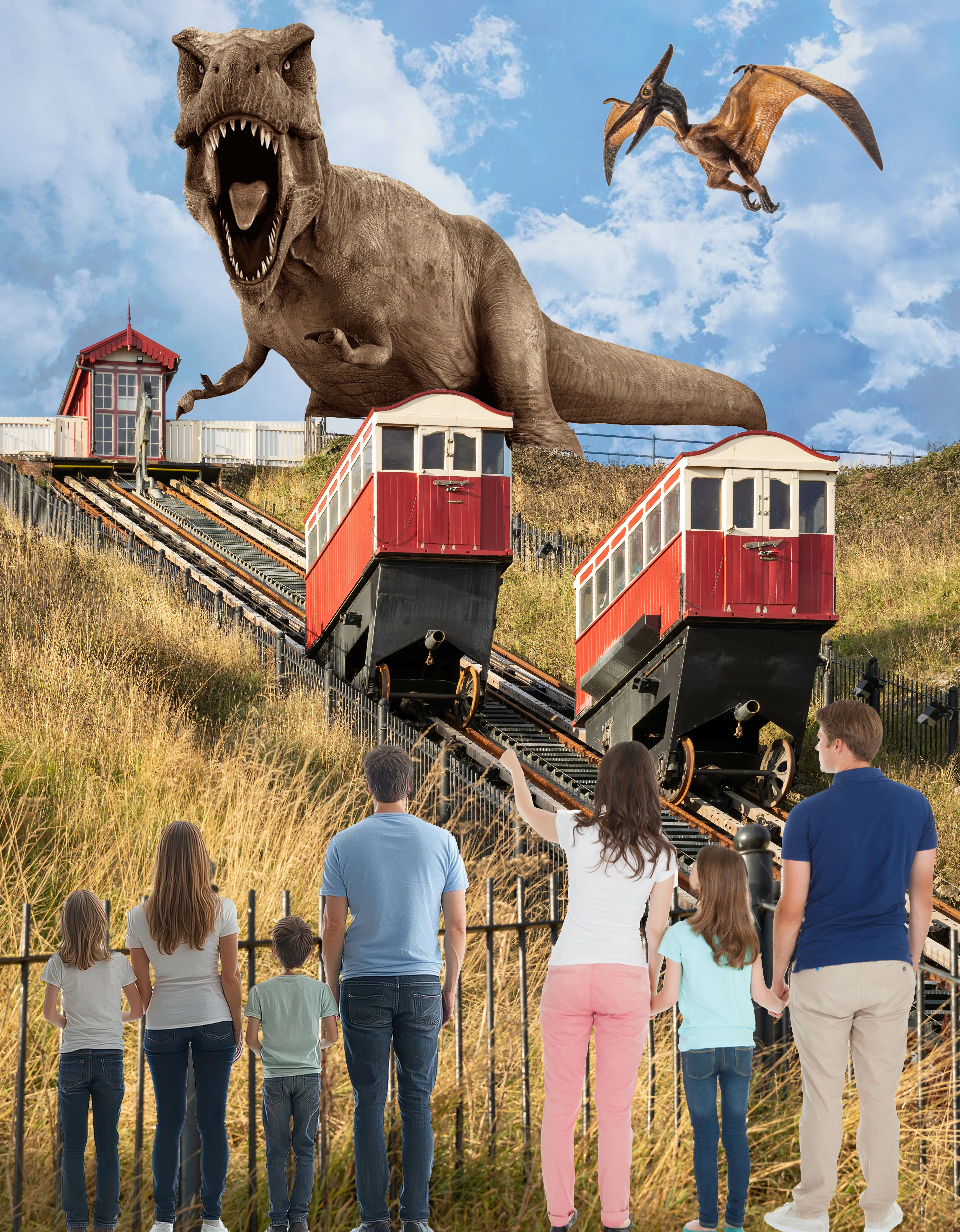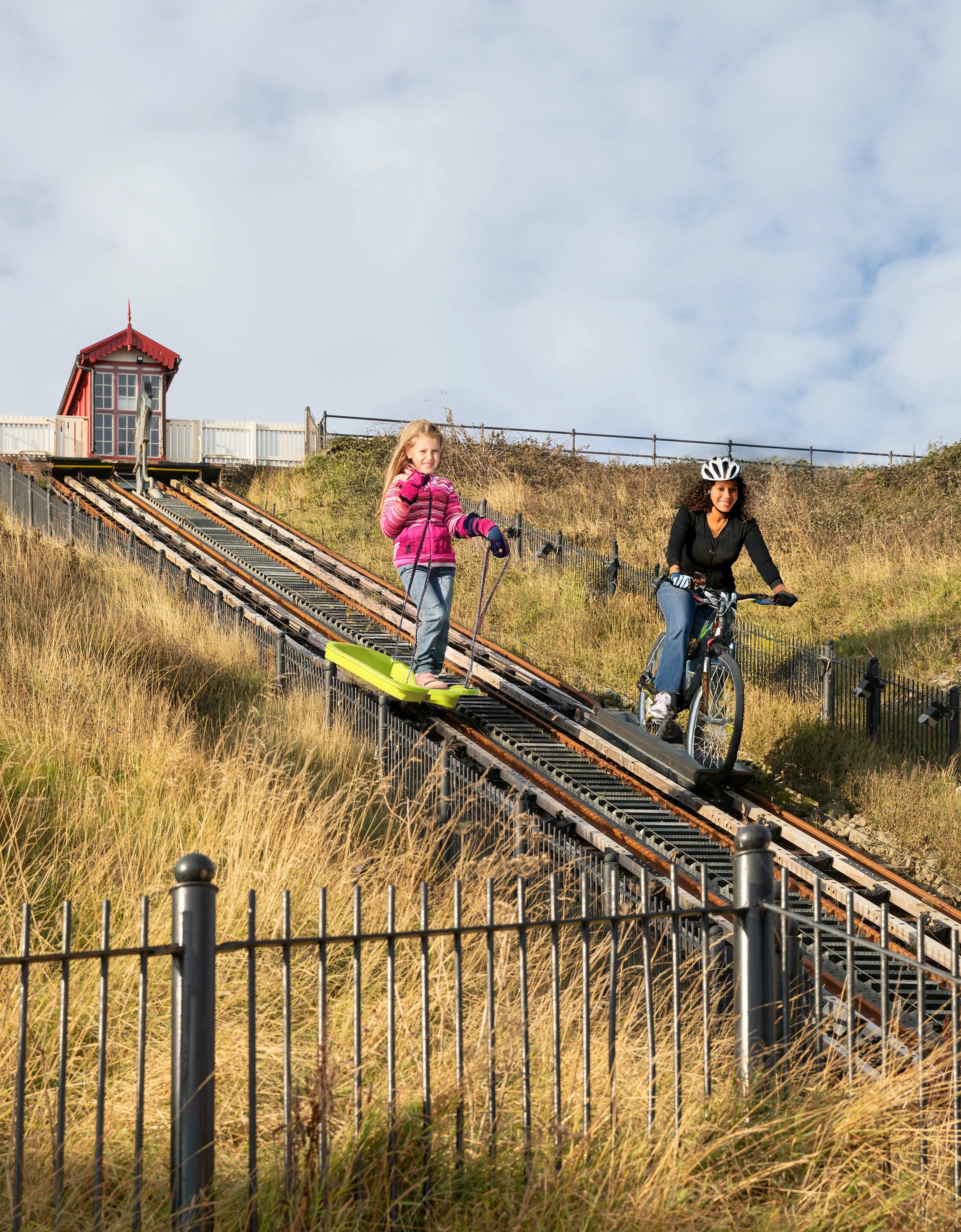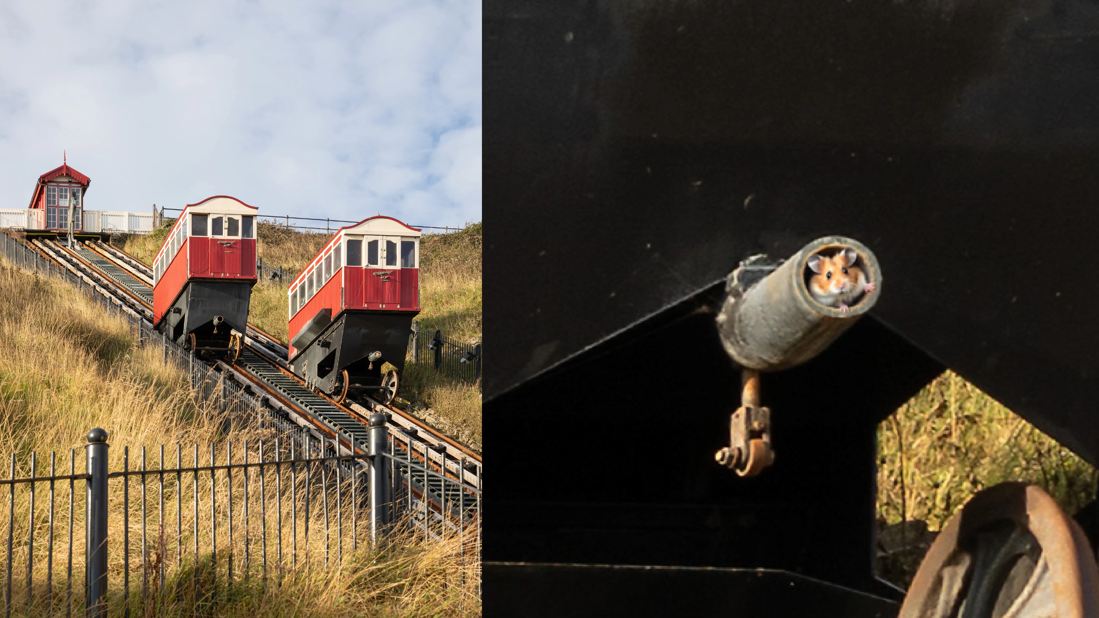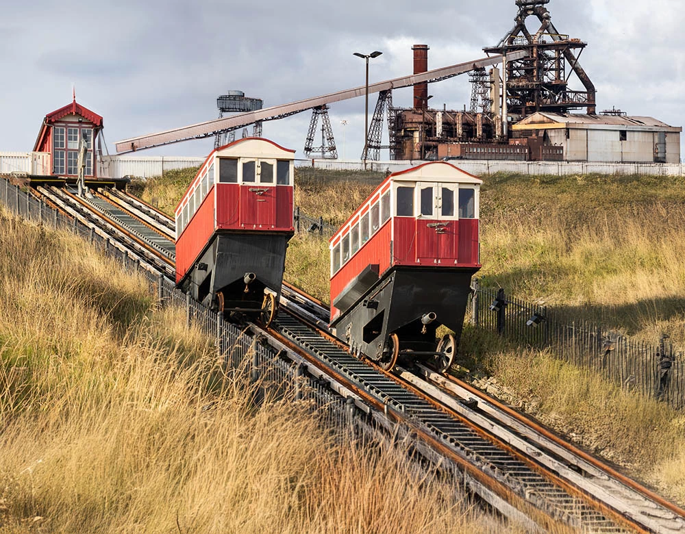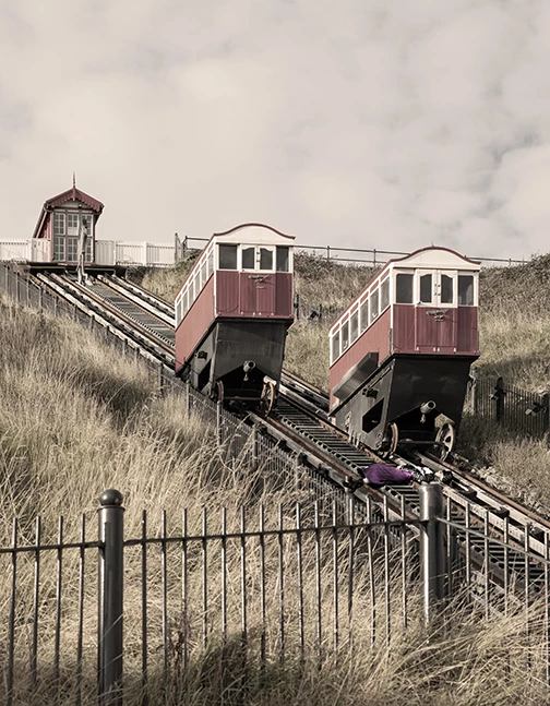 This week we start outdoors. This is the Saltburn Cliff Lift which is a funicular railway on leading down to the promenade and pier, in Saltburn on the north east coast of England. Constructed in the 1880s, it has been updated several times, but is still powered by water. The tank underneath the upper car is filled with water and when it is heavier than the car at the bottom it descends and pulls the lower car up, all controlled by the brakeman in the wheelhouse. At the bottom the tank empties and the upper car is filled. The water is pumped back to the top.