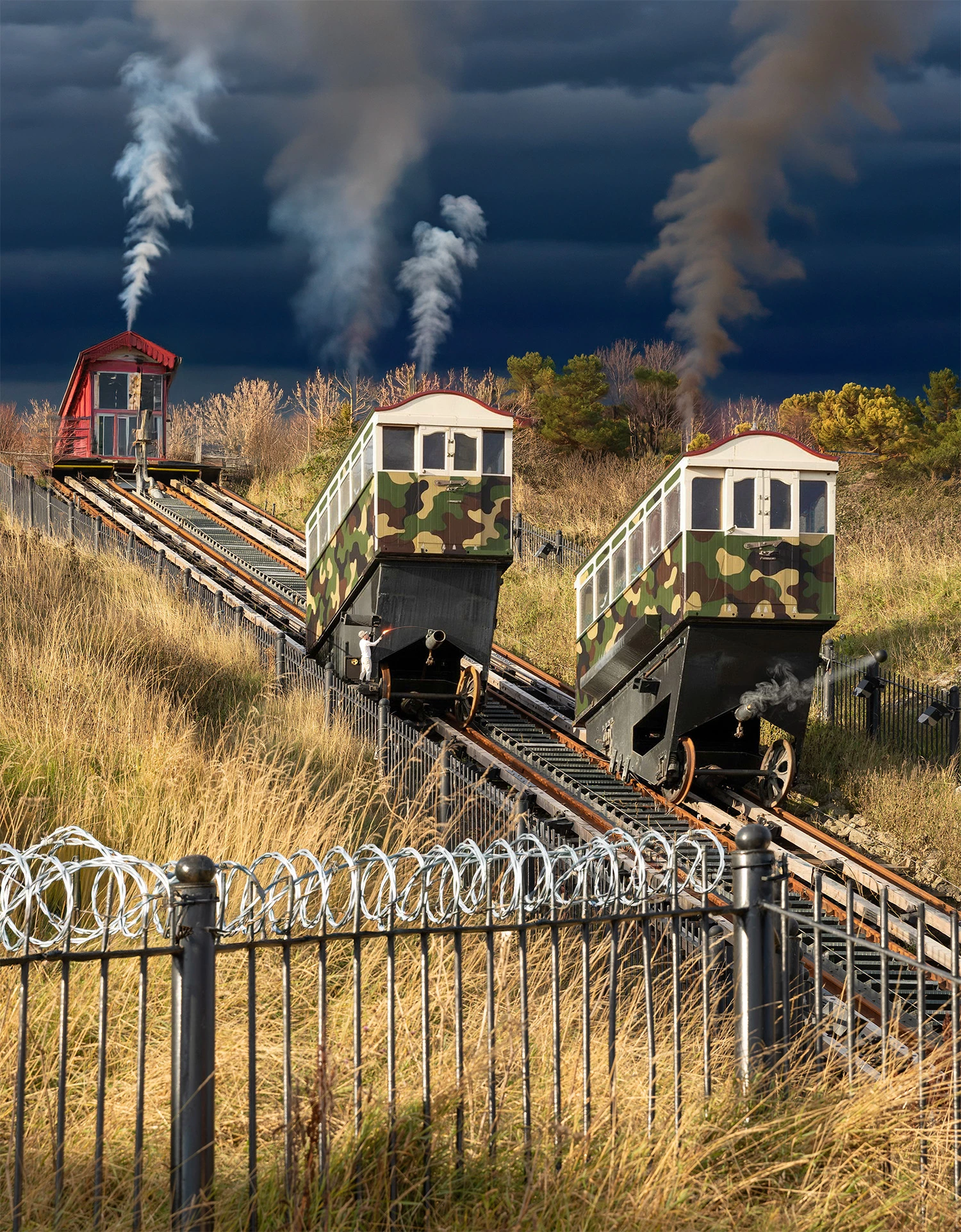 Haha! I love the spouts turned into cannon and the barbed wire is a nice touch. 'In the army now' also explains why the carriages are nipping down for a smoke! 🙂