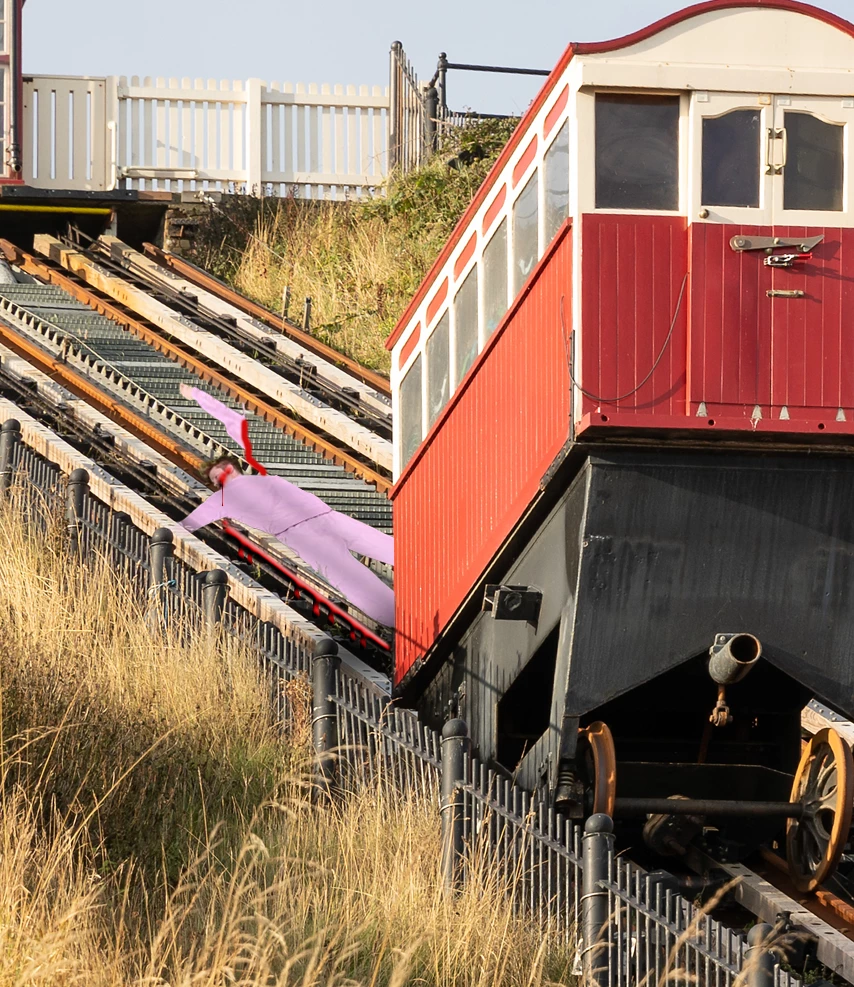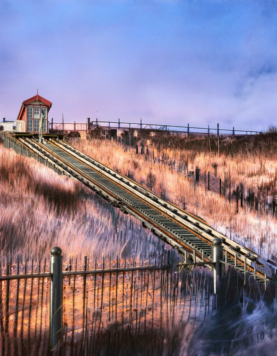 This week we start outdoors. This is the Saltburn Cliff Lift which is a funicular railway on leading down to the promenade and pier, in Saltburn on the north east coast of England. Constructed in the 1880s, it has been updated several times, but is still powered by water. The tank underneath the upper car is filled with water and when it is heavier than the car at the bottom it descends and pulls the lower car up, all controlled by the brakeman in the wheelhouse. At the bottom the tank empties and the upper car is filled. The water is pumped back to the top.