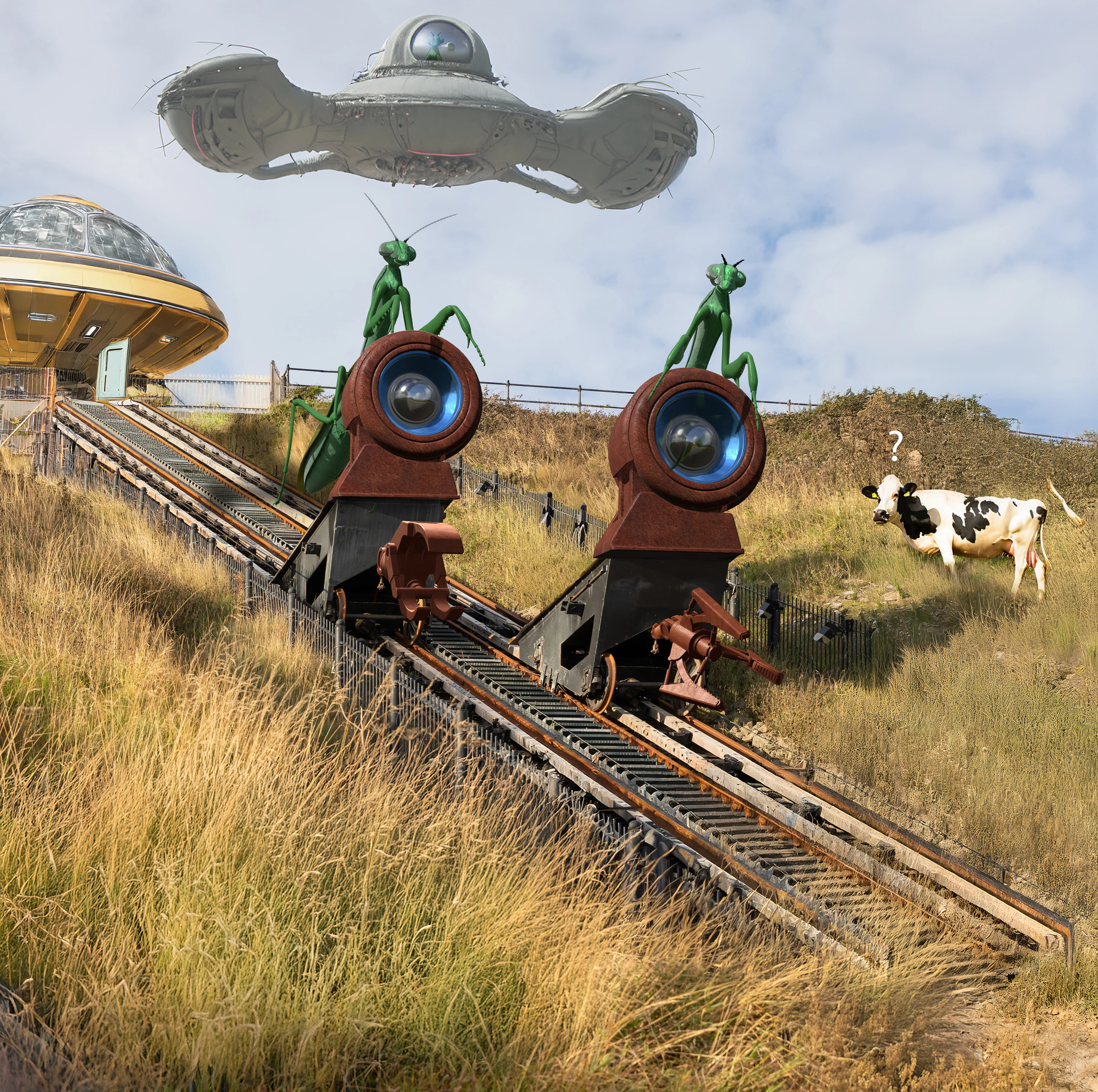 After all, who doesn't love an alien invasion? Well, except the cow. She does seem a bit confused. The alien on the right is looking at the BBC natural history crew filming the event. (They may have been abducted, or gone joyriding in the alien transport. If you come across them, tell them Broadcasting House wants its cameras back.)