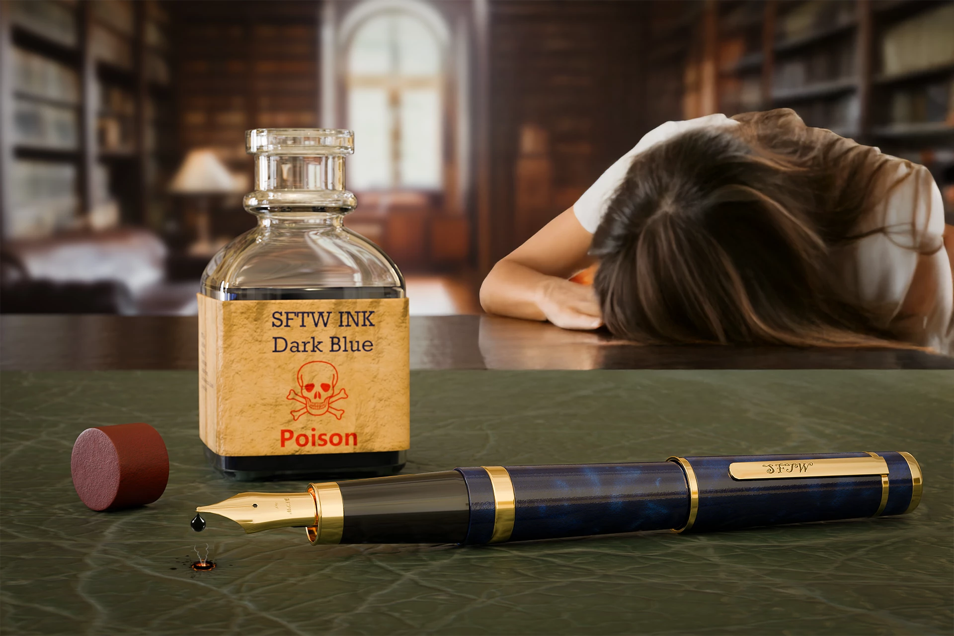 This week something a bit different. I heard the phrase 'Poison Pen' in a TV drama recently and my thoughts arrived at the image below. Made in 3D, the objects on the 'desk' are from Substance 3D assets, which I textured, along with the desk, in Substance Painter.  The background was AI generated in Photoshop, using Firefly, and blurred to match the image before taking into Blender prior to rendering. Finishing was in Photoshop.