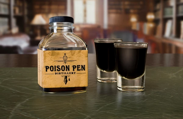 For this challenge, I felt like "Poison Pen" sounded like a cool name for a distillery. So I took the starter image into Photoshop and used "Generative Fill" to begin removing elements such as the pen and the cap on the table, and added in shot glasses and a cap to the bottle. I also removed the branding on the bottle, generated a brand logo using Adobe Firefly, and then placed it on top of the bottle.