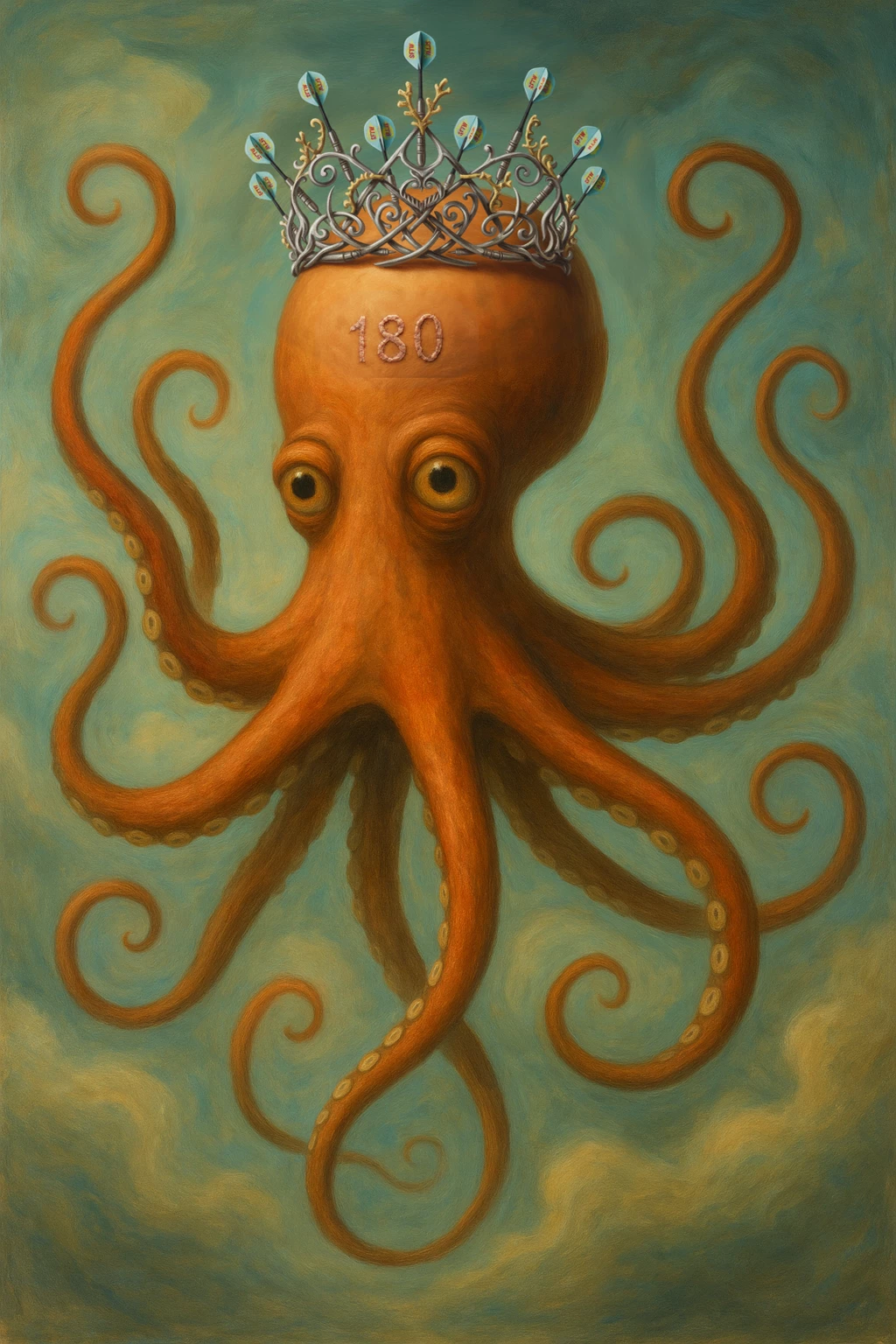 Here's my creation! I aimed to make the tentacles resemble the darts, but I struggled with that (any advice would be greatly appreciated!). I started by creating an image on Firefly and was prompted to create an octopus in the style of Salvador Dali's surrealism. I then added a crown made of darts, along with a big "180" on the forehead.