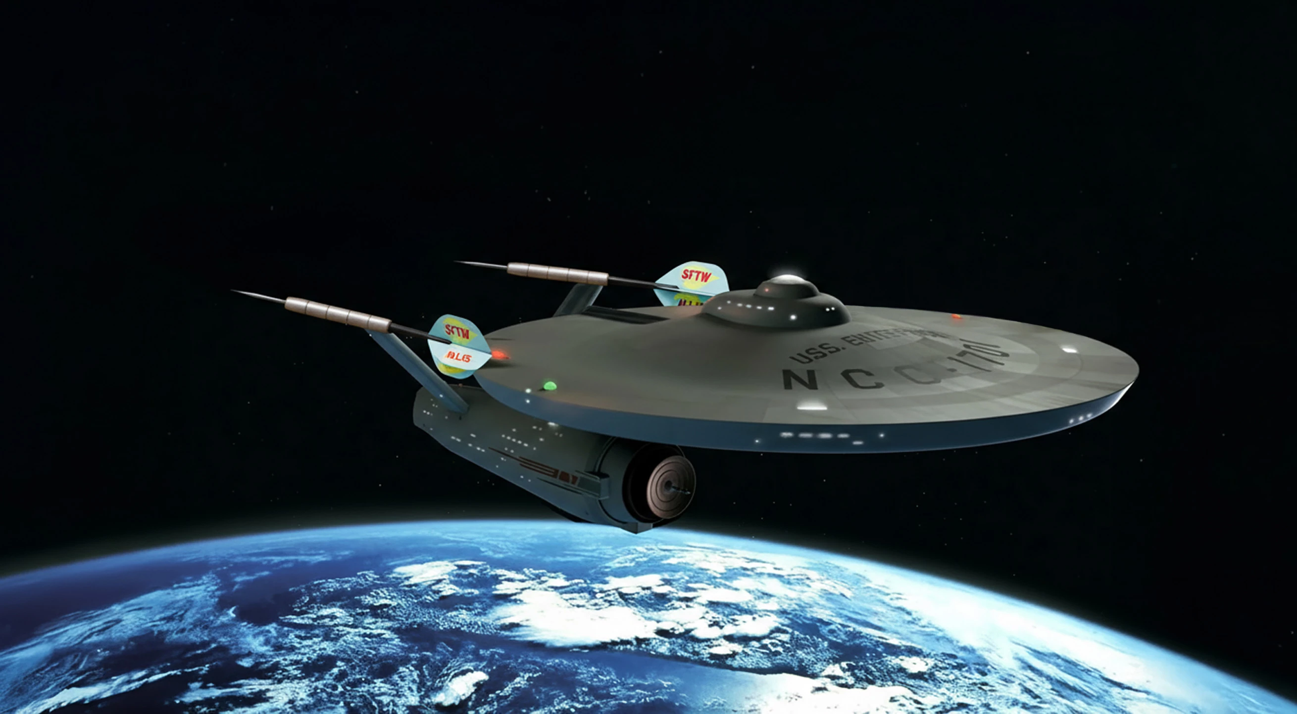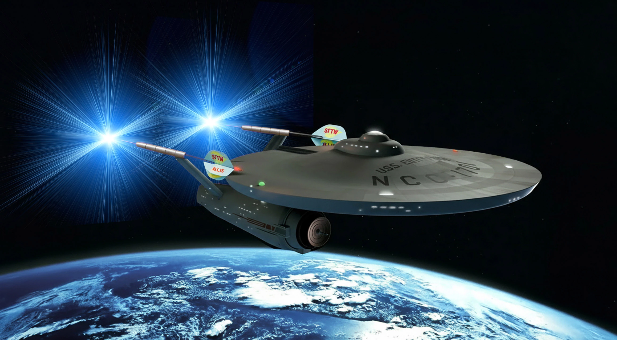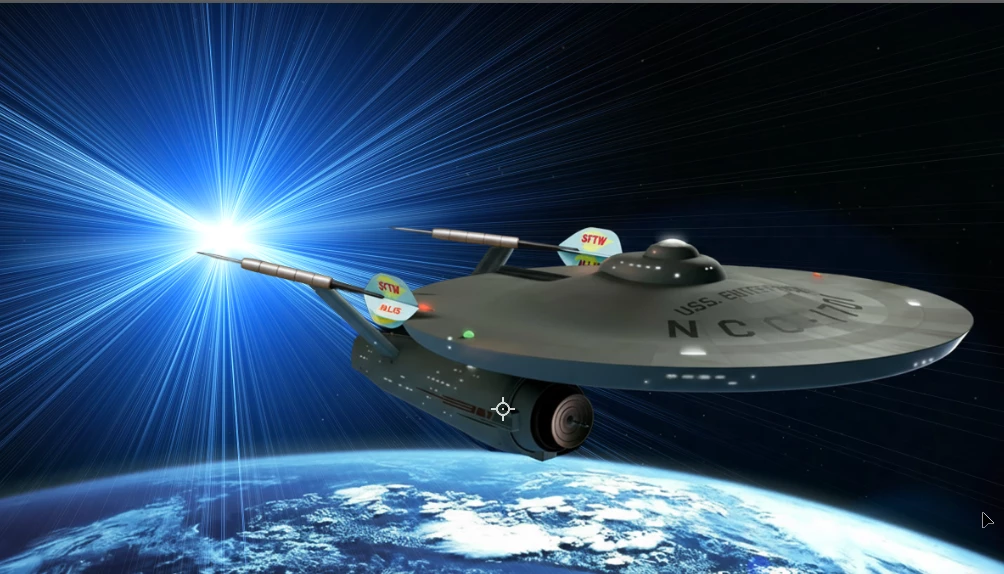 A great idea JR.  I looked at this and was thinking of how the Enterprise goes into warp, or in this case comes out of warp.  I've used a Nukly.com flare for this, but render fibers and Polar Coordinates would do the same thing.  But it's not that simple, is it?  The flare is symmetrica, but we need a distortion that brings the axis of the imagined cone inline with the Enterpise direction.