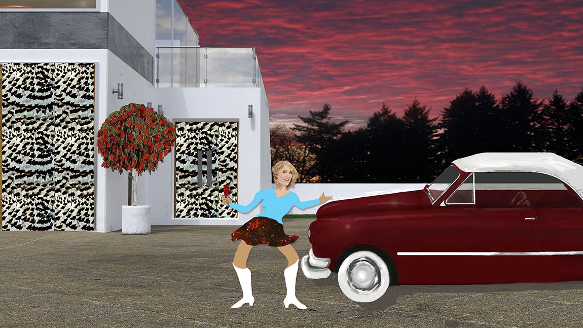 Funny! That's it? She's got long legs. What about the tree - it's a Bottle Brush. What car is in the picture? All of the art is mine, some old stuff but its supposed to be fun and funny so you have my permission to mess with it if it gives you joy.  Best fun JH