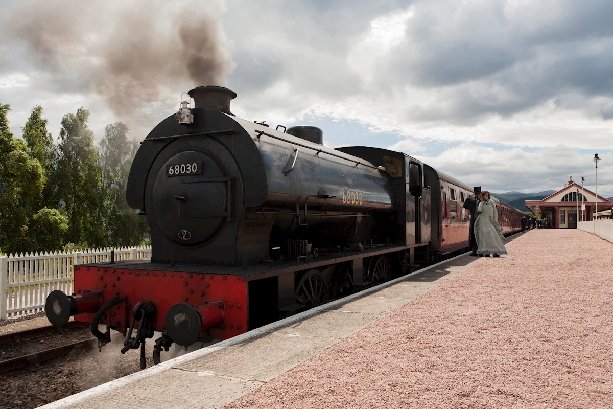 The train standing at platform 3 of Aviemore station, in the highlands of Scotland, runs on the Strathspey steam railway. Situated in the Cairngorms national park, Aviemore is popular with walkers and cyclists in the summer and snowsports enthusiasts in the winter.