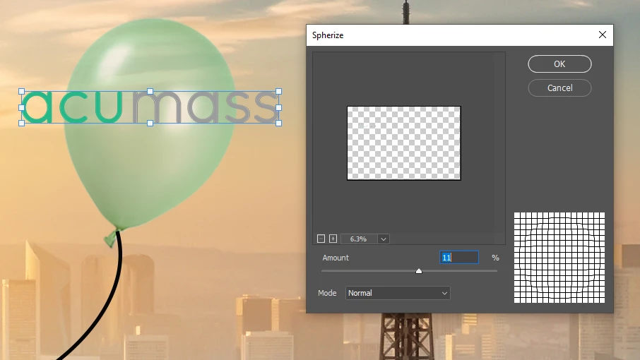 I have a text object that I am trying to place on a sphere. I have rasterized it and opened the spherize tool. But the text does not show up in the preview window for the tool. What am I missing here?
