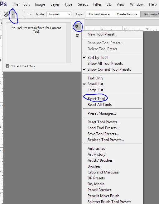 I am trying to work out when i click on the spot healing brush, it's showing up as a cross not a circle. Once i enlarge to like 65 a very small circle then comes up which i am still unable to do anything with. Has anyone had this issue?