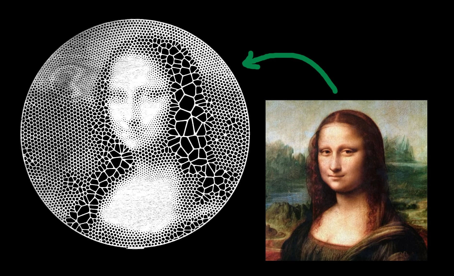 any way, how can i get the photo into a mosaic view like this. In the photo, the detail points are made of small dots, and the large and dark parts are made of large polygons. Can anyone help me do this with phone app or any software?