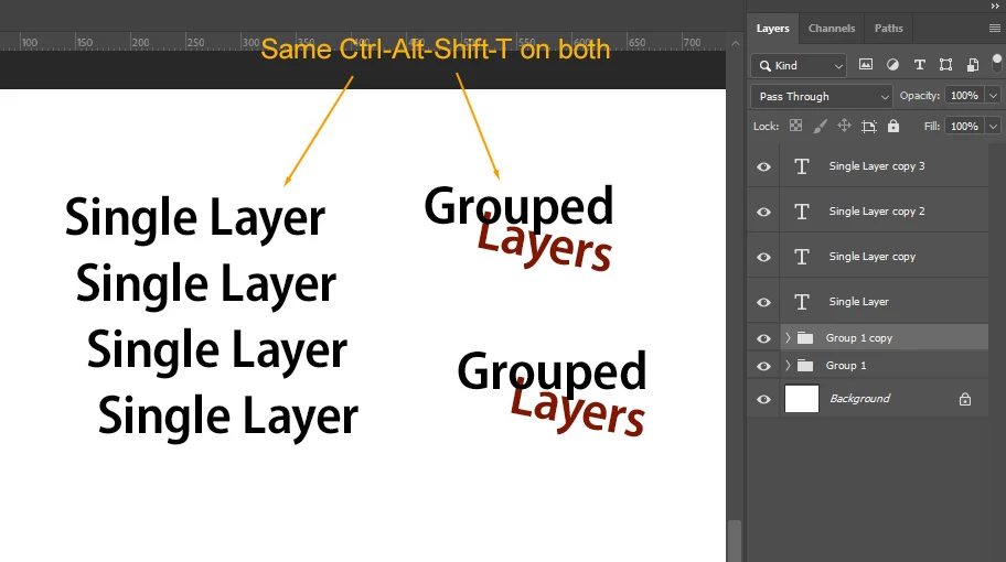 Issue: Using Ctrl-Alt-Shift-T to apply previous transformation (step and repeat) on a DUPLICATE layer only duplicates when you select a single layer, not when you select a group.