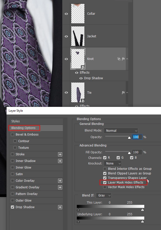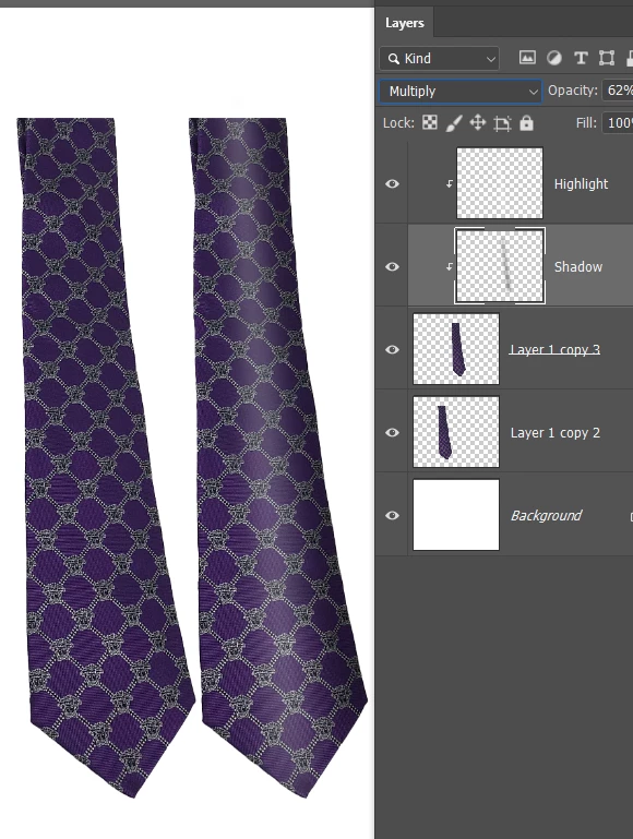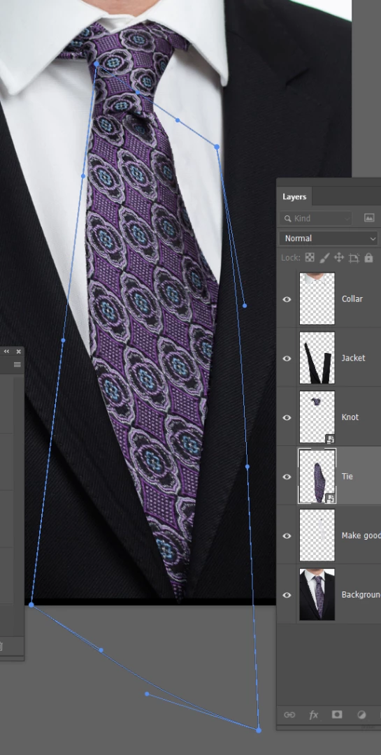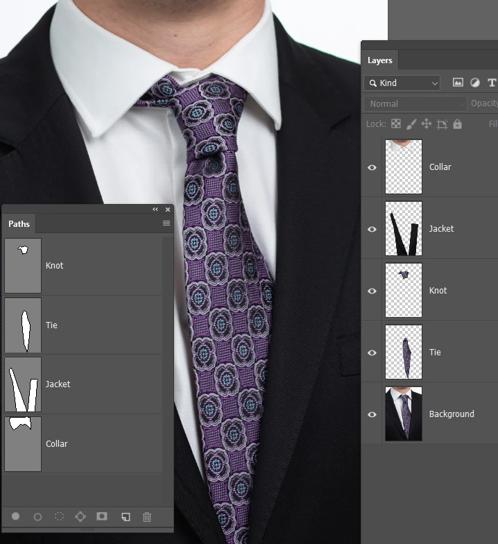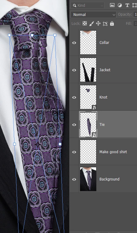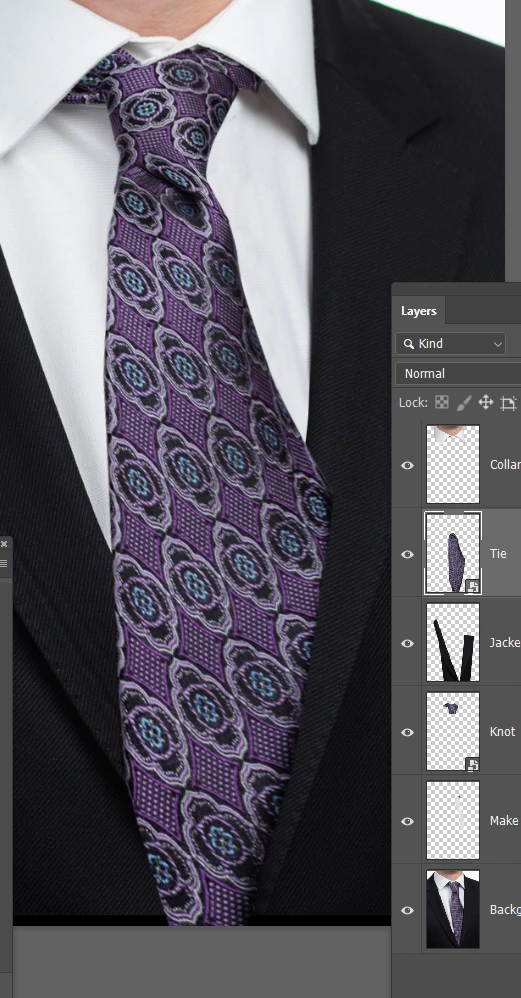 The layer order is important, because the higher layers need to overlap the lower layers. (the collar overlaps the tie after we move the tie)