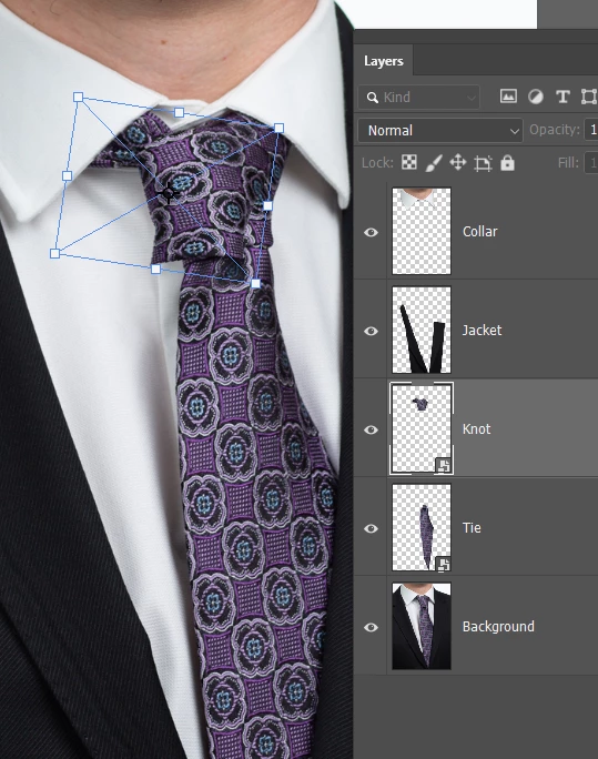 I've moved the tie as well, and made a new layer below the tie and knot layers to fake the missing shirt area