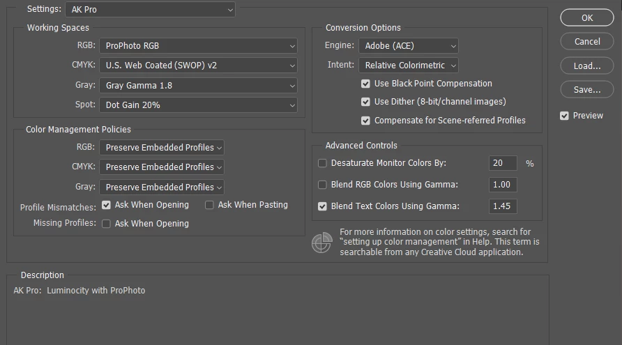BTW, there is no particular advantage in ProPhoto for luminosity masks. A luminosity mask is lifted from a (slightly modified) Lab L channel, and the mask is identical whatever the document color space.
