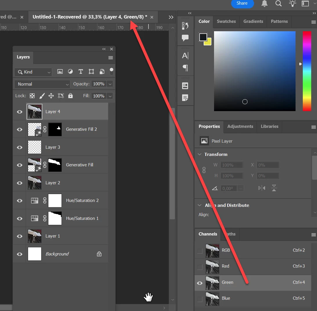 Below is an explanation of how you likely obtained the word "green" on the tab, as shown in your screenshot. Click on RGB in the Channels panel to resolve the issue.