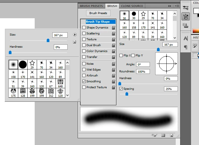Brush: plain circle, we've always used 25% spacing without problem. If we remove spacing, instead of getting smooth shading, we get hard lines.