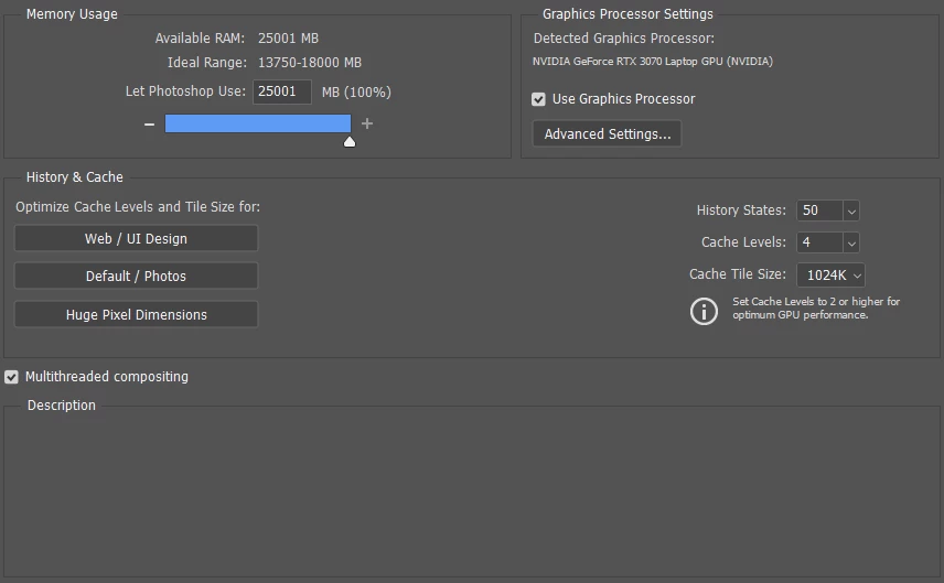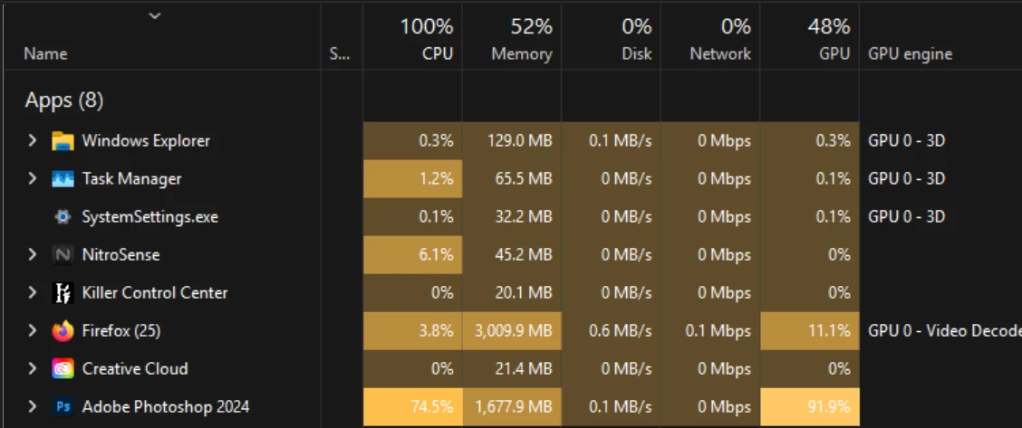 My V25(long term support) photoshop seem to not working properly causing lag and stutter performance while other softwares do not, especially when I use brush or rotate tool, photoshop's task manager process will immediately consume up to 100% both CPU and GPU.