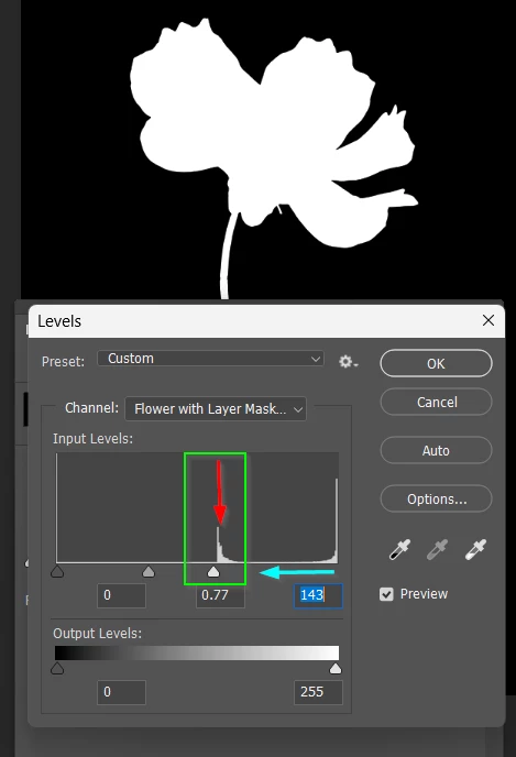 That little spike in the middle of the histogram (red arrow) represents the grey area. By moving the whites slider to the left (cyan arrow) and just to the left of that spike, will make the greys full white, and thus full transparent when you return to the image.