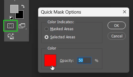 1) I have Quick Mask set to Color Indicates — Selected Areas