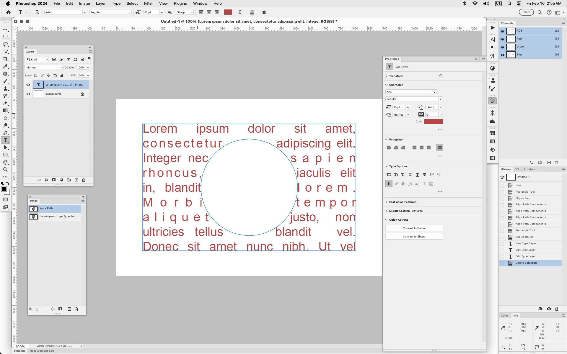 I've created the path i need (first drawing the rectangle, then the circle and making sure 'exclude overlapping shapes is selected). Select the type tool and click inside the path....job done....not this time however 😕😕