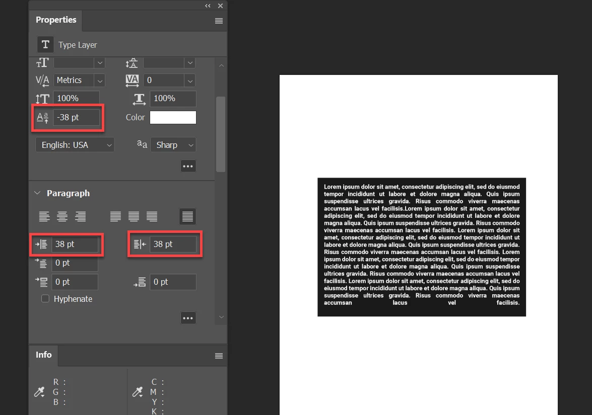 I am placing a text box on a photo in photoshop. The box is rectangular and will have a background color. I am entering justified text into the shape. I need to have a margin or padding between the text and the rectangular shape.