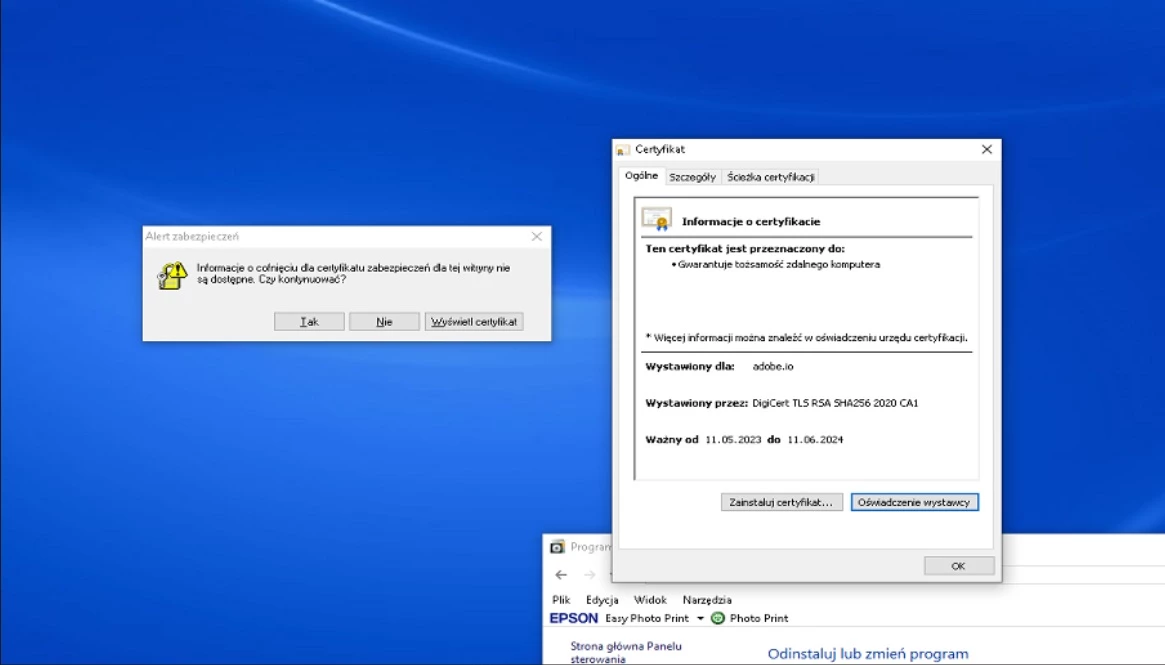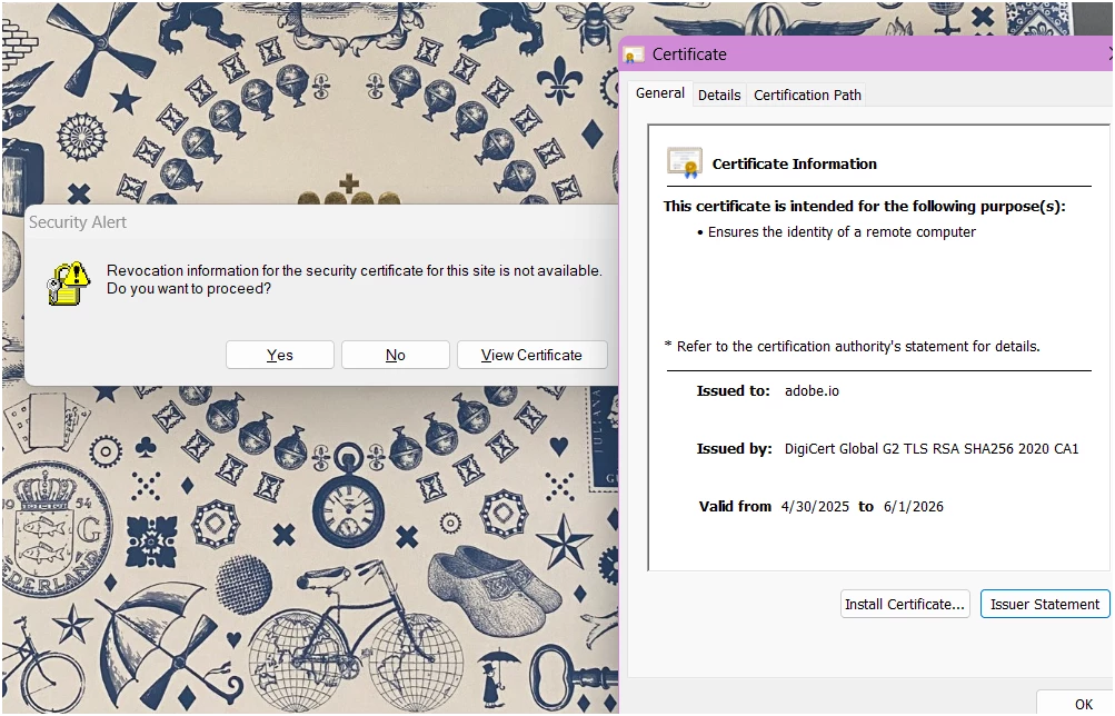 I have a problem, I keep getting the message on the left saying "Revocation information for the security certificate for this website is not available. Should I continue?"