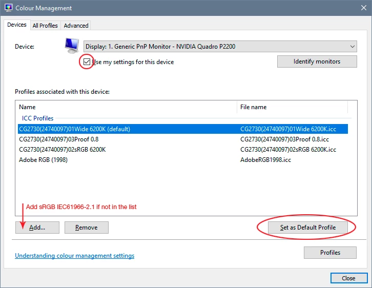 Replace the profile here. Delete the Viewsonic profile (it's defective and useless), and replace it with sRGB IEC61966-2.1: