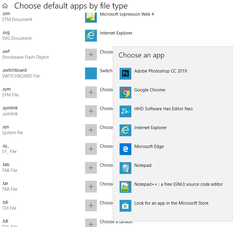 However, on my machins it looks like Phtoshop CC 2019 set .AI file associations to Photoshop CC 2019 but ,svg are associated with Microsoft's Internet exvlorer IE