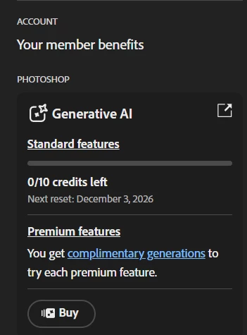 The user's monthly generative AI credits in Adobe Photoshop are not resetting on a monthly basis as per the subscription plan terms. The account interface incorrectly displays the next reset date as one year in the future, rather than the following month's billing cycle date.