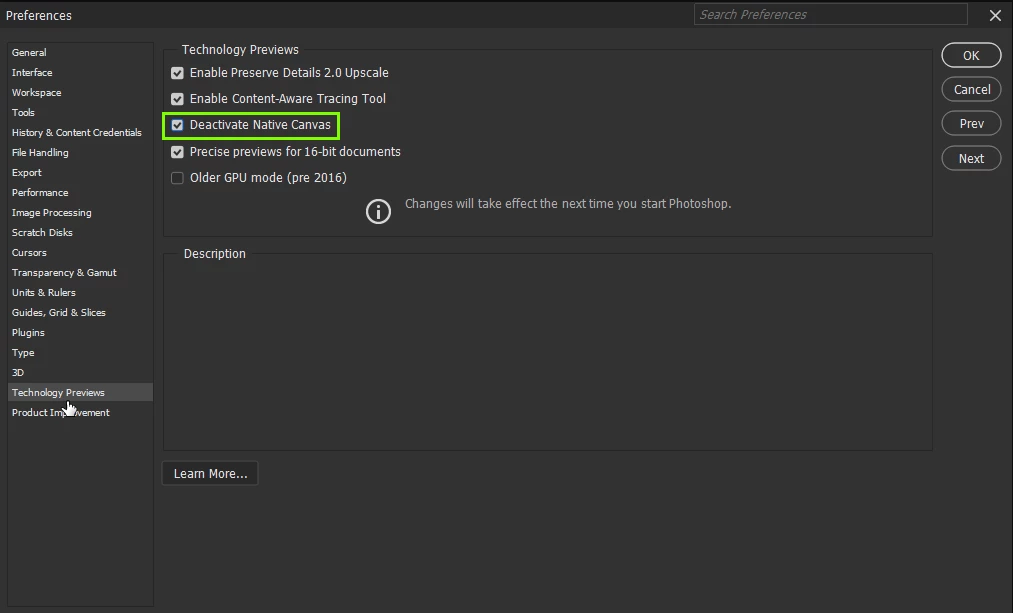 One more thing to try, enable this option as well, again restart Photoshop