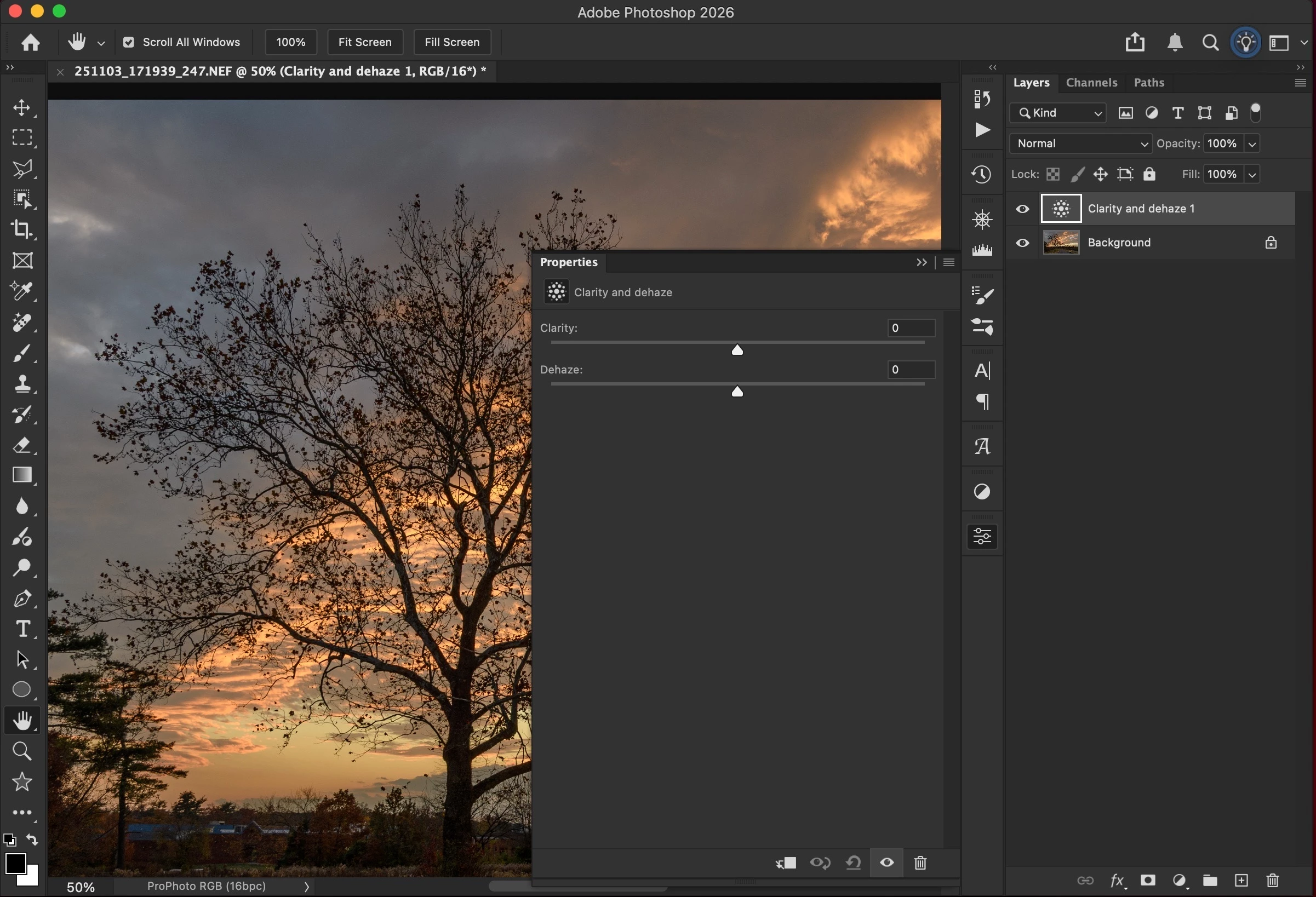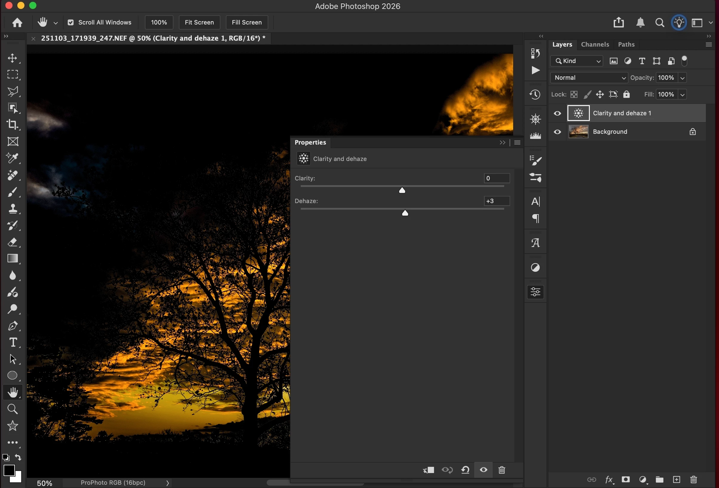 When I open a 16-bit ProPhoto RGB image in Photoshop and add a Clarity and dehaze adjustment layer the Dehaze function wildly over processes the image in comparison to what Dehaze would do in Camera Raw (as a Filter) or what it would do back in Lightroom with the same image.