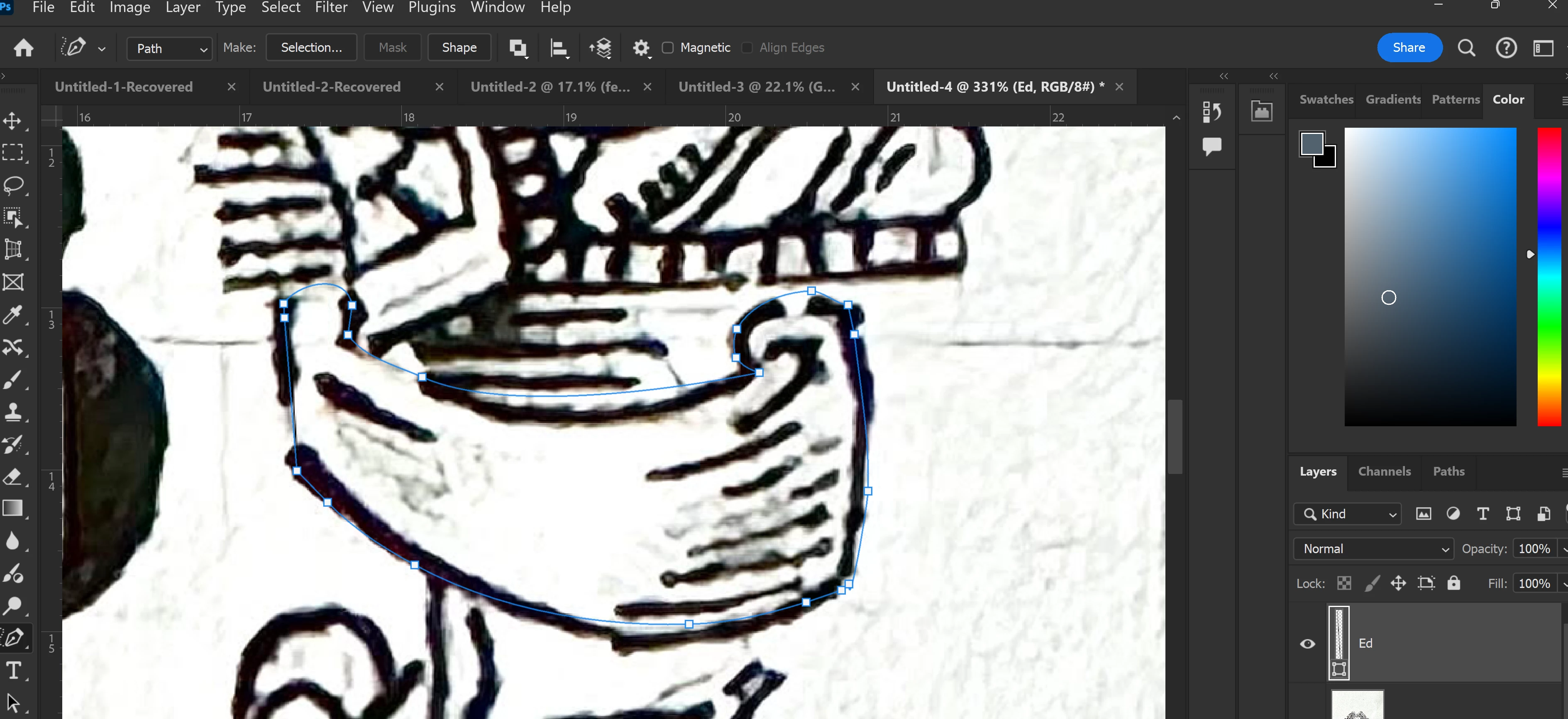 However, I've seen tutorials on YouTube and the "pen" tool apparently keeps tracing something called a "path" and as below, my tracing is highlighted in blue (it's crudely done to show the issue I am facing) if you can hopefully see it;
