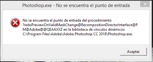 Después de instalar photoshop por segunda vez, sigo viendo este problema de "¿No puedo encontrar el punto de entrada del procedimiento? Rehacer PreviewOnValidMaskChange @ RecompostionDirectorInterface @ PM @ Adobe @@ QEAAXXZ en la biblioteca de enlaces dinámicos C: / Archivos de programa / Adobe / Adobe Photoshop CC 2018 / Photoshop.exe "Soy Windows 8.1 y ya he intentado desinstalar e instalar Visual C ++. Ayúdame por favor, gracias.