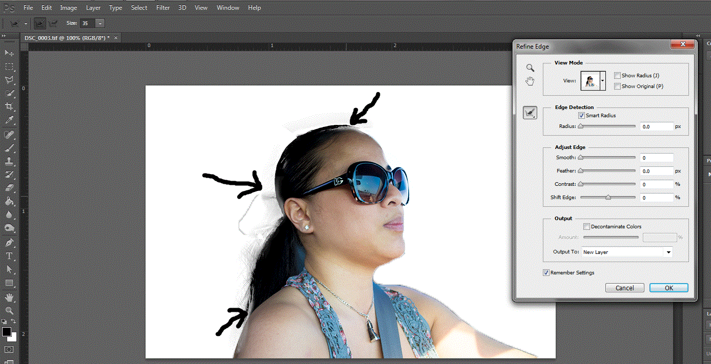 Hi everyone. I'm trying to get the refine edge tool to work. I selected my image using the quick select tool, then I click refine edge. When I move my cursor around the edge pressing the mouse button to make my adjustments the image is being erased instead of picking up the hairs. I do not have my refine edge brush set to "-", it is set to "+". I dont have anything else in the refine edge menus selected, it is at default. I even tried to enable Smart Edge and other features in the refine edge menu, but it still doesnt pick up my hairs instead it removes my "line"....very aggravating. I've used this tool before and I never had a problem....Please help with any info or advice! I've searched the entire internet and cannot find anything that resolves this issue...thx