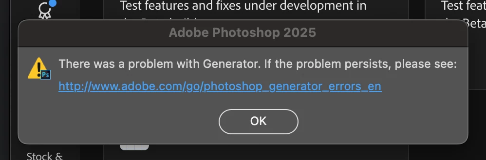 "There was a problem with Generator." error popup at start on new install of Photoshop 2025