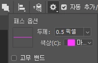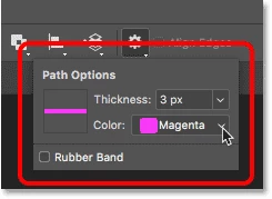 This opens the Path Options dialog box where you can change the thickness of the path outline from as small as 0.5 pixels to as large as 3 pixels. You can also choose a different color for the path. I'll set the Thickness to 3 px and the Color to Magenta. Note that these settings are there only to help you see your path as you're working. They have no effect on the actual appearance of the path in the document. To close the Path Options dialog box, click again on the gear icon.