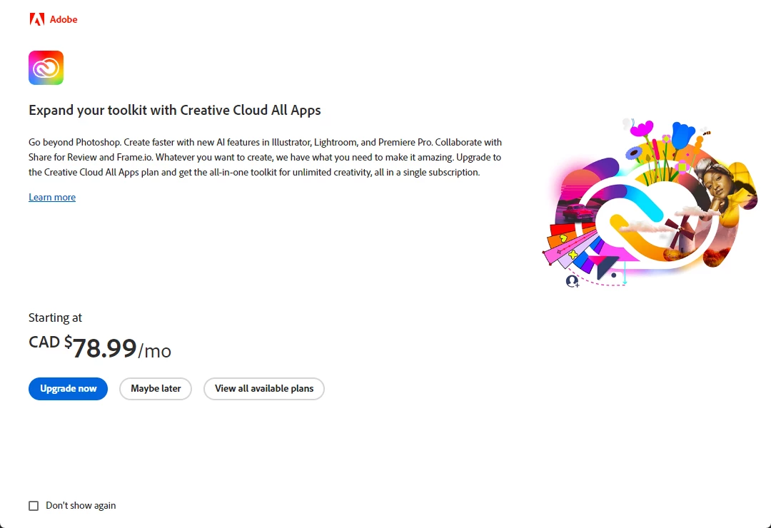 Every single time I open Photoshop, Adobe thinks it's not enough and tries to force me to cough up $79 for all the apps, most of which I'll never use (I only want to use Photoshop and Acrobat).