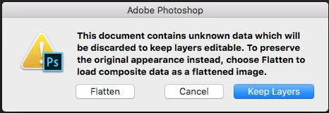 This document contains unknown data which will be discarded to keep layers editable CC 2018