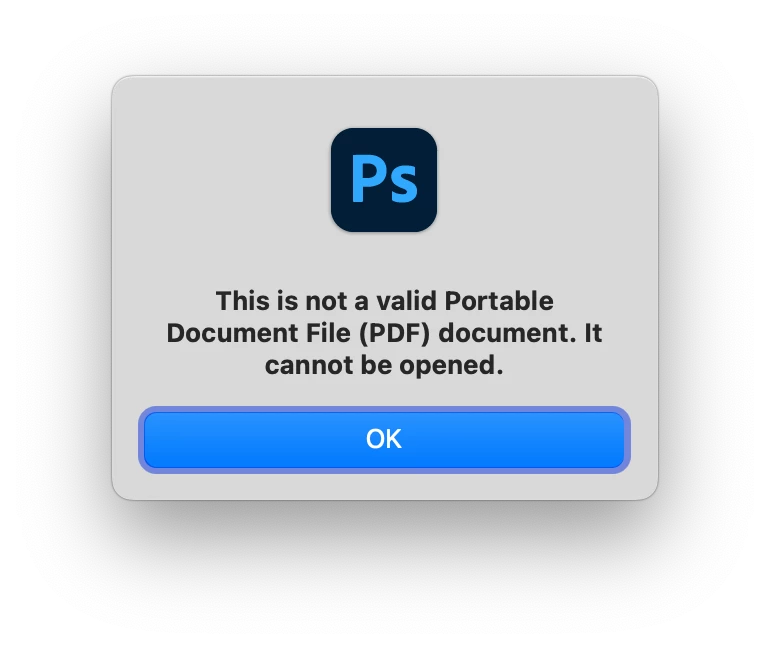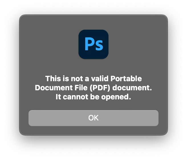 "This is not a valid Portable Document File (PDF)..." random error in Photoshop