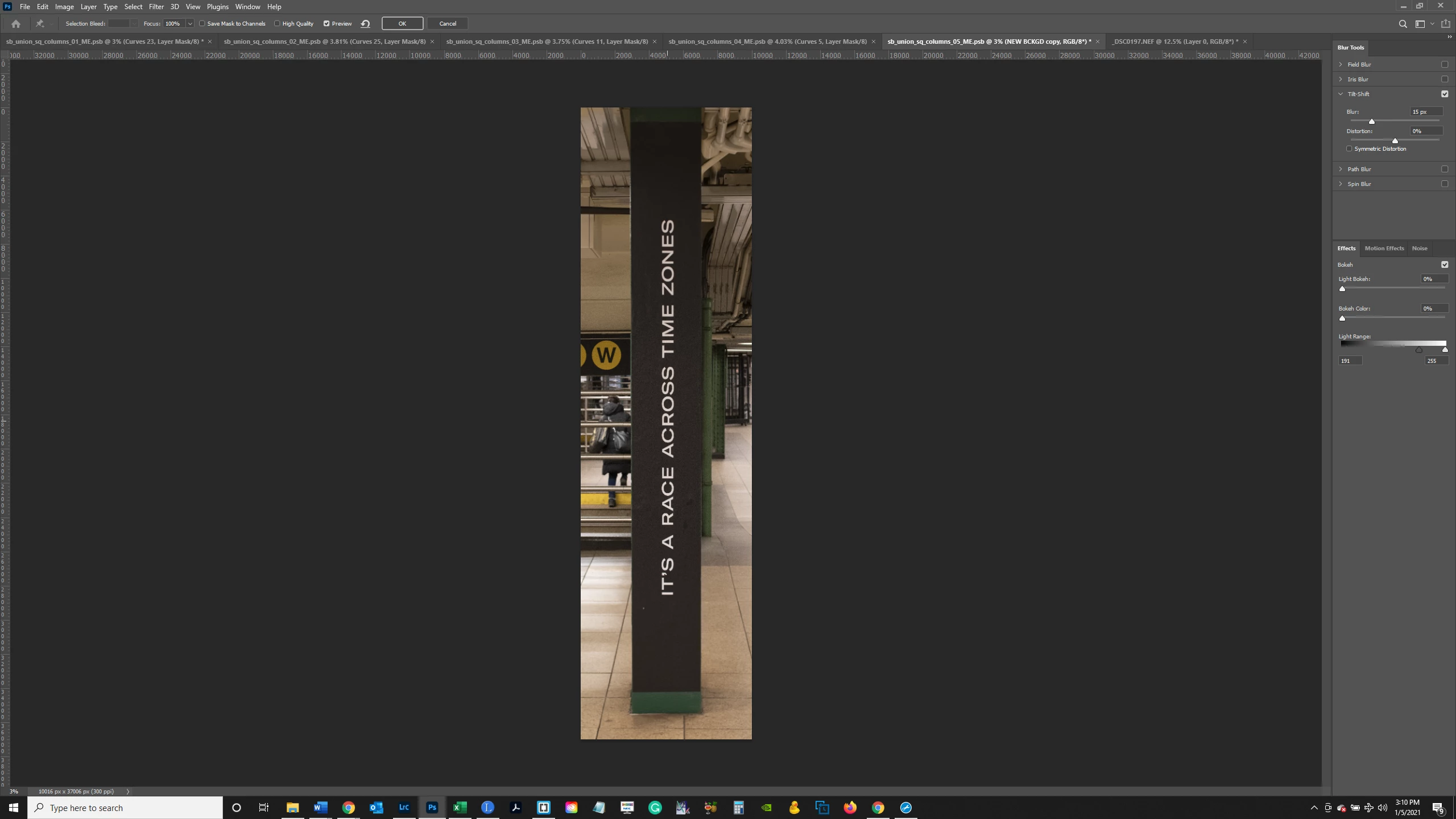 I'm using the Blur Gallery for the first time and trying to apply a Tilt Shift blur to the Layer below.  In the 2nd screenshot, you can see what happens after I select Tilt Shift from the Blur Gallery - nothing.  The cursor shows a pin and when I click in the desired area, the horizontal lines showing the Focus, Fade and Blur areas are suppsoed to come up - but nothing happens.  Anybody know why?  Thanks.