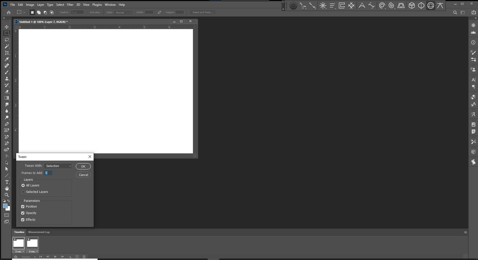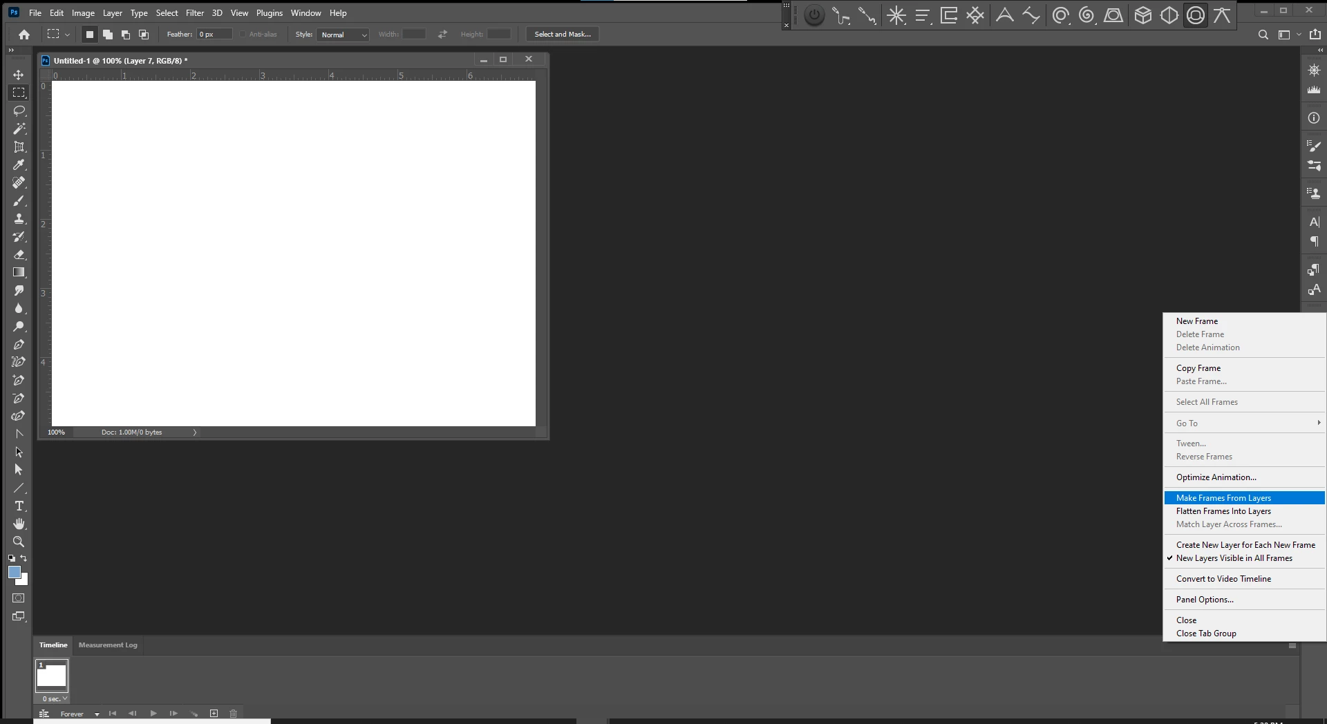 I have about 26 layers already in my 2nd file (video 2) and want to preview the video in timeline. But when I open Timeline to Create Frame Animation (see first screenshot), only one frame (the last frame of my animation) shows up in the horizontal preview (I've tried alternately to select the first frame of my animation and also select all frames of my animation before trying this). Then when I toggle between views to the list preview (sorry don't know what it's called) (see 2nd screenshot), all the frames are there. I figure I picked up some wonky setting from the original file. Does anyone know how I can clean the slate and start new so all my layers also show up in horizontal frame animation view? I've selected Delete Timeline from the Timeline menu, but even though I then save the file and try Timeline again, the same thing happens.