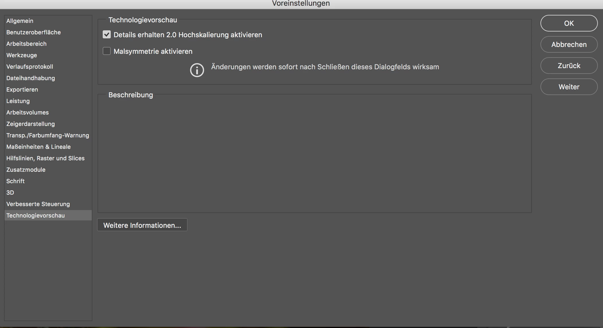 Auch andere Google Ergebnisse haben mir nicht sonderlich geholfen, da ich diese Optionen in meinen Einstellungen in Photoshop gar nicht habe.