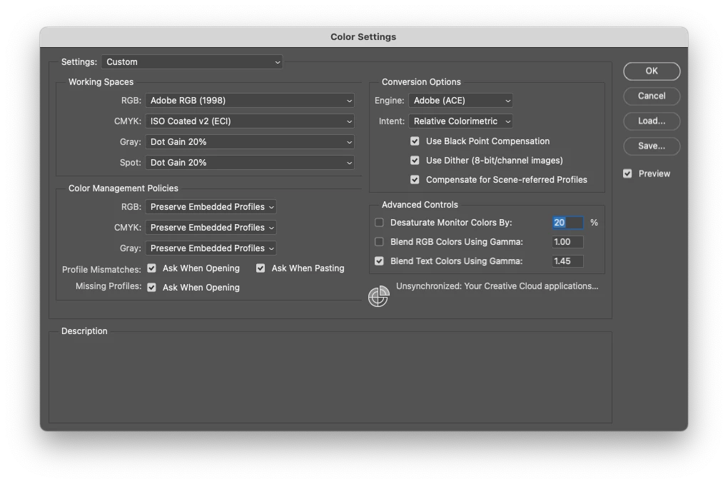 Hey @Earth Oliver here are my and my colleagues PS color settings, I ensure our team use the same settings in our Adobe Suite Apps to ensure the same outcome and consistance delivery of all our assets.