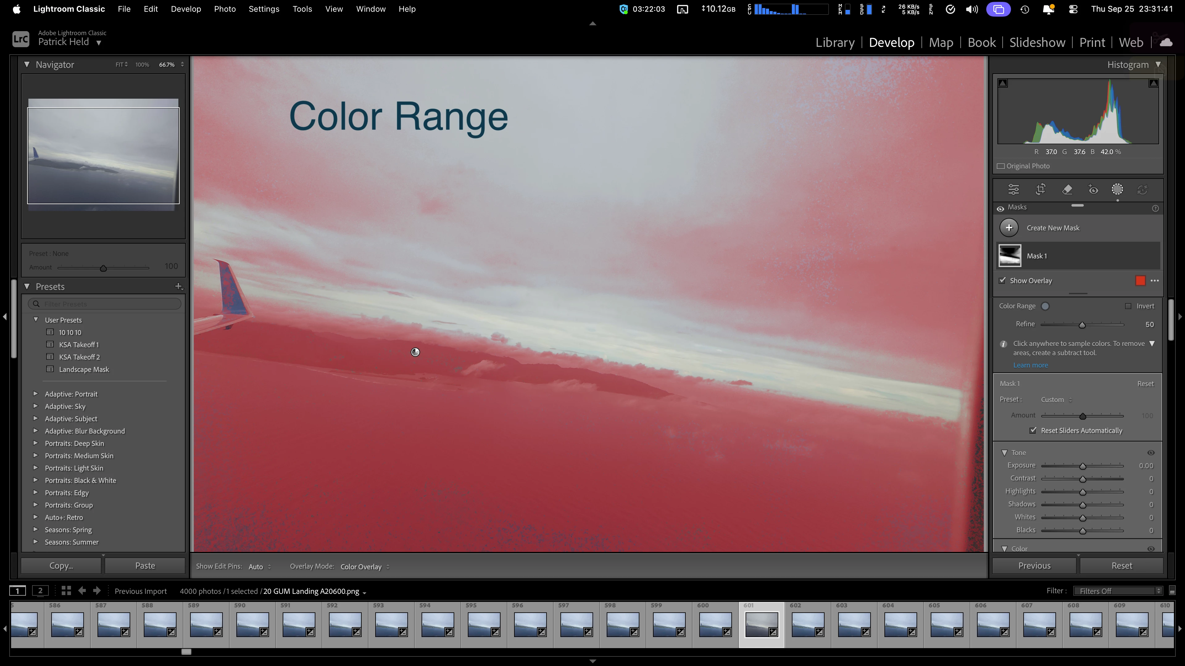 Note - I'm using the "sync" feature to apply the masks across several thousand pictures. Keep in mind the plane is moving so the position of the island moves slightly in each frame. While the AI "Mountains, Vegitation, Water" masks recalculate and re-generate across eash frame, the "Object" mask is not doing as good of a job, since there are objects close to the edge of the island (a marina) that I want to leave in the water mask, but slowly move their way into the object mask as the marina moves, as the plane moves.