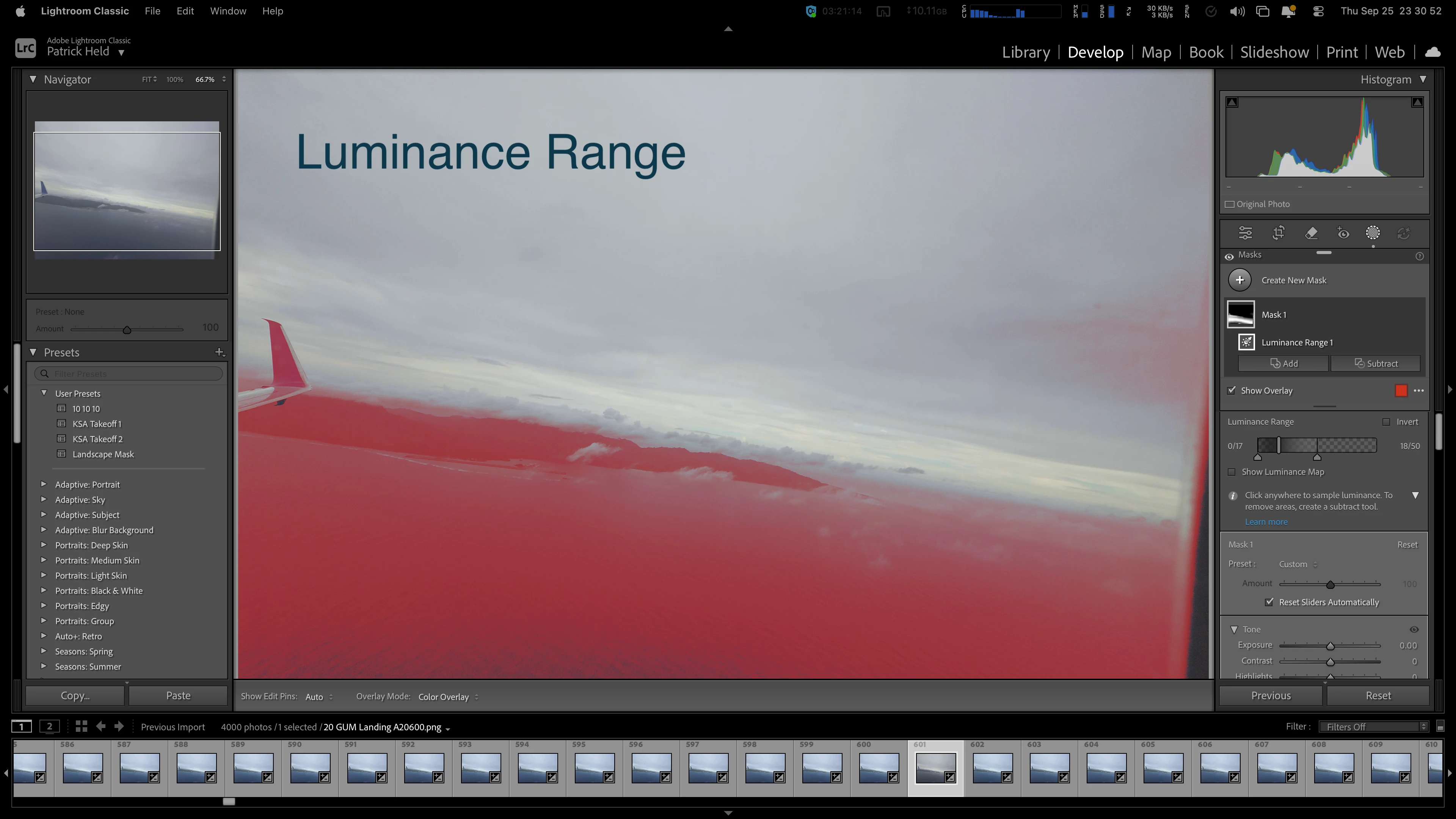 For the final minute or two of the video, the plane is so far away from the island that ACR can't recognize the island as vegitation or mountains, however the island is much darker than the water and sky. I tried using the Color Range and Luminance Range masks to isolate the island, however it keeps selecting more of the picture than I want.