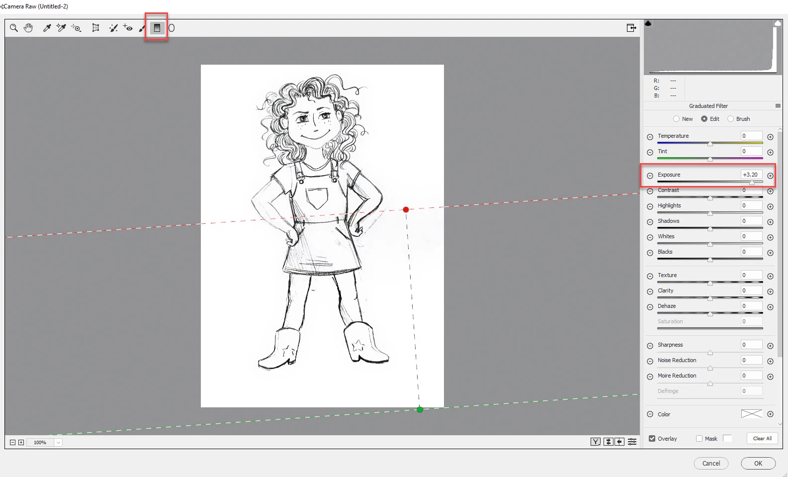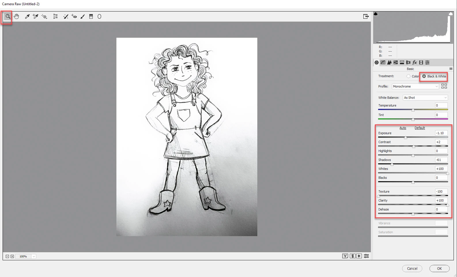 I've attached images for reference. I want to be able to open the sketch (left) in Photoshop, adjust the color/contrast to black and white to look like the finished product (right) and then sharpen lines/erase smudges manually.