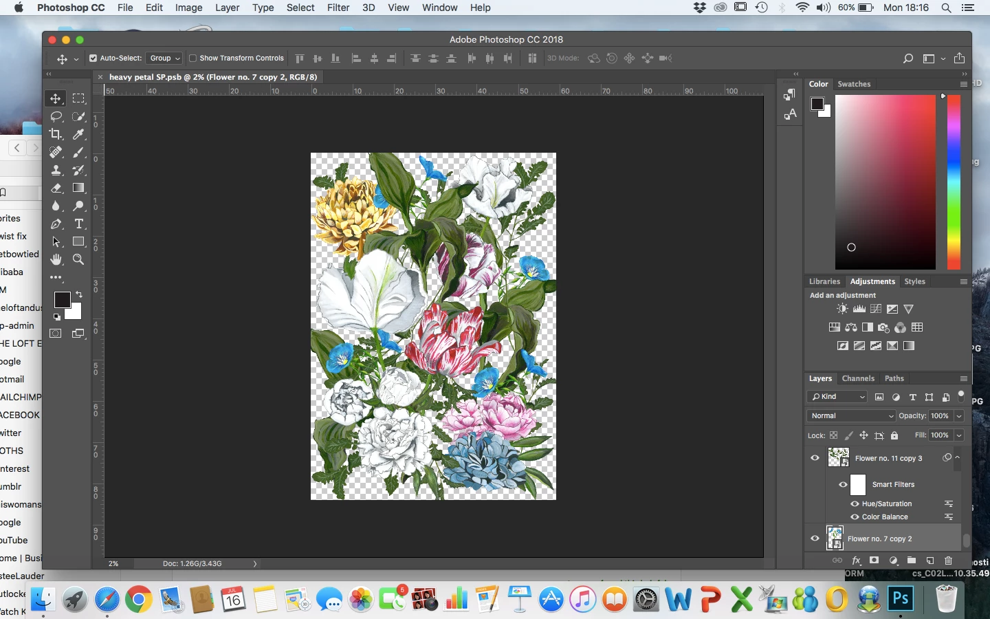 I had the flowers hand painted flowers in the image below scanned into my computer and then vectorised in illustrator now they have been placed in photoshop.