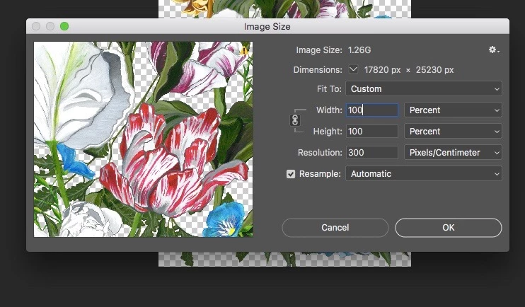 I am trying to save the file as a TIFF file which is what they requested for them to be able to create the repeat pattern but with photoshop only allowing TIFF files of up to 4GB to be saved it won't let me do it.